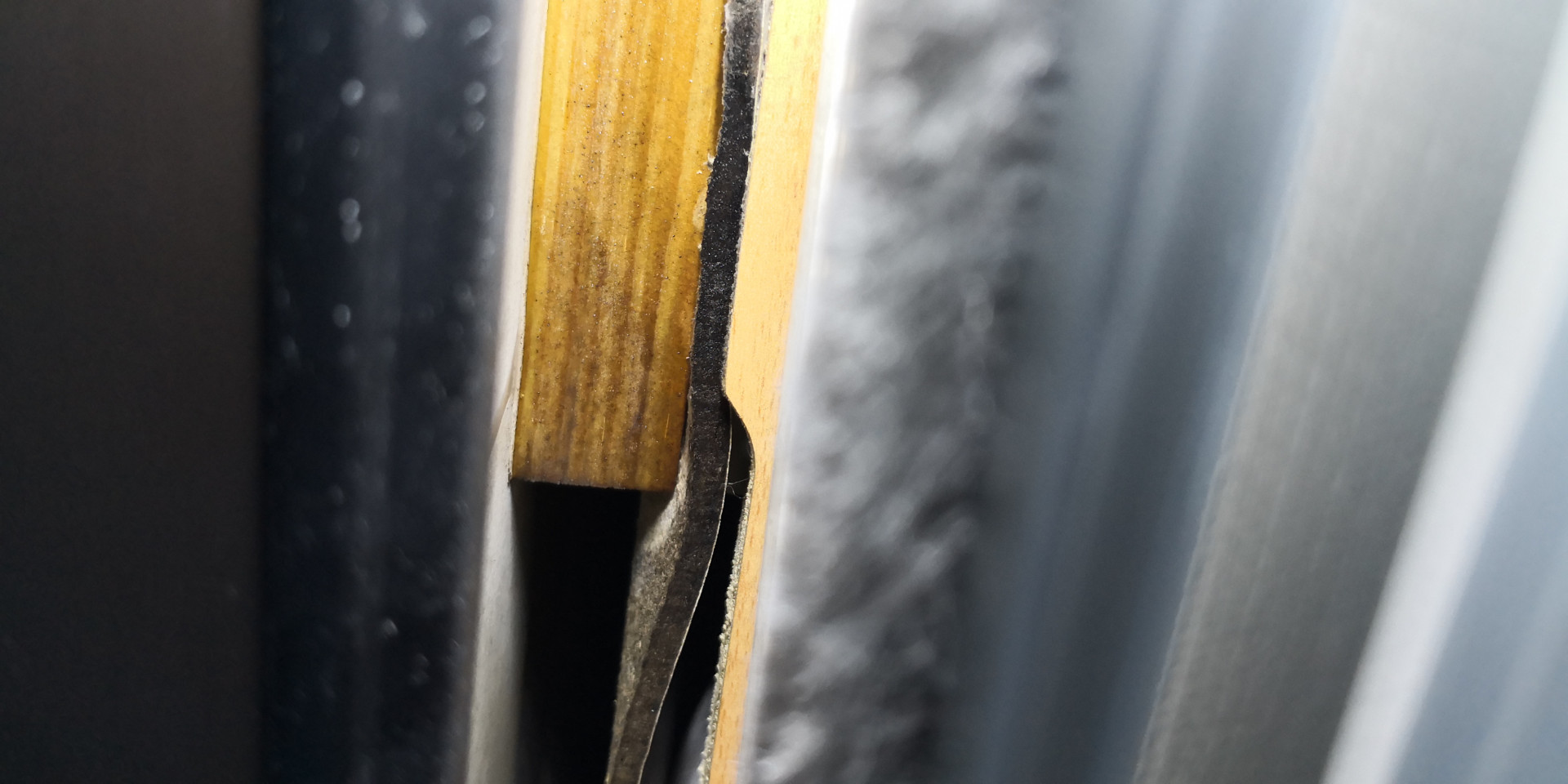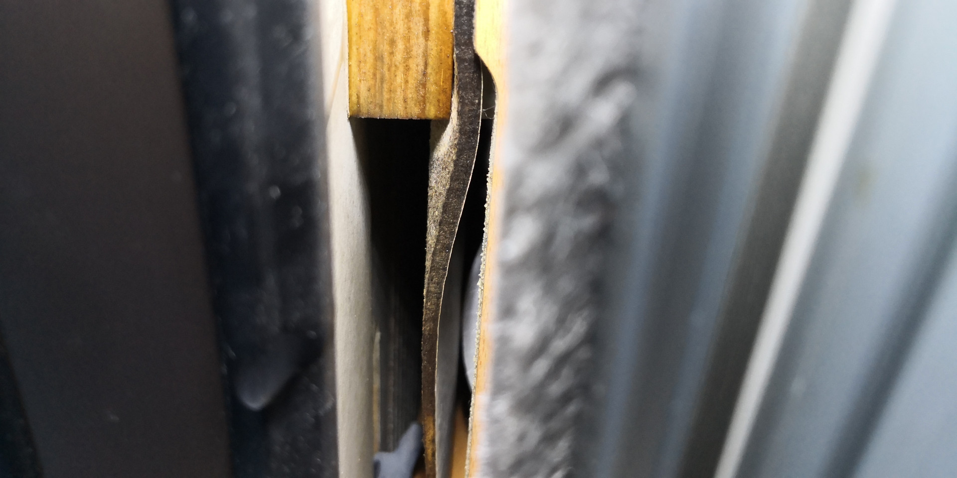 Tuo keittiön kaapissa oleva thule muoviläpyskän ympärillä näkyy vähän tollasta kosteuden aikaansaamaa epätasaisuutta mutta kaapin puolelta se on ainakin ihan kuiva. Sen kaapin takaosan pinan takana oleva puupalikka on ainakin kuvien perusteella läpimärkä.