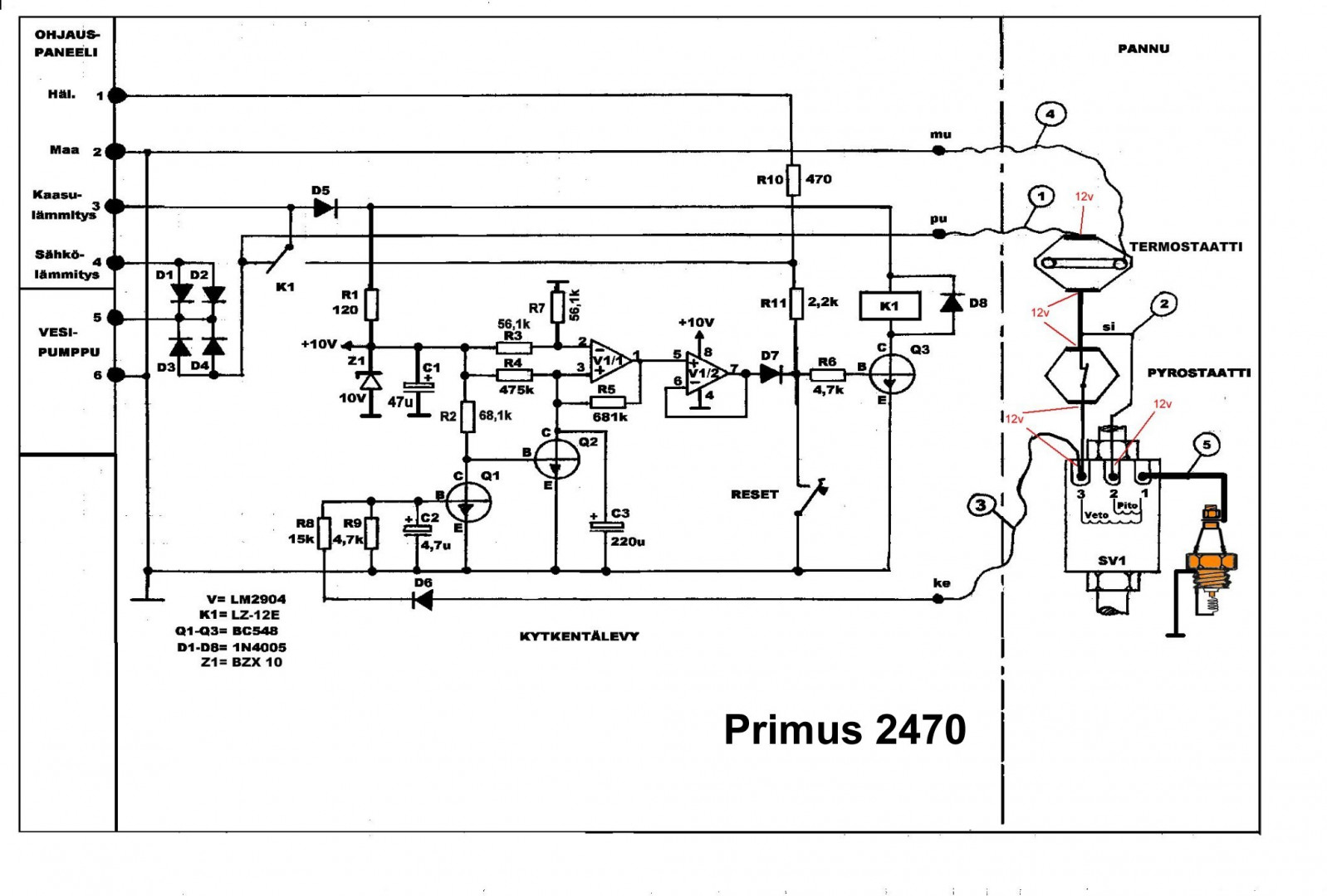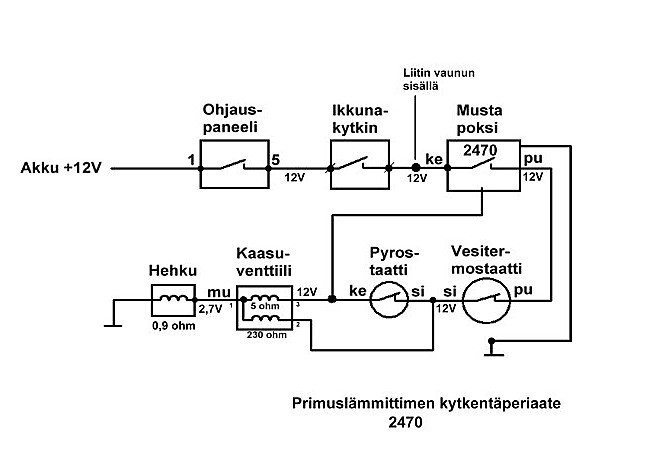 Vesitermostaatti ei myöskään katkaise pannua, kun veden lämpötila nousee. Ja sehän nousee kiehumispisteeseen, koska pumpulle ei tule jännitettä. Vesitermostaatin jännite pysyy pannun jo alkaessa kiehumaan koko ajan tulo- ja menopuolella samana. Riittäisikö vesitermostaatin vika aiheuttamaan myös tuon pumpun virrattomuuden? Ja ohjauksen toimimattomuuden kaasunkatkaisuun?. Minulle kulkeutui Solifer 550 -88 vaunu, jonka Primus 2470:ssa tätä samaa vikaa. Hehkun osuminen runkoon ei aiheuta ongelmia. Jotain muuta olet tehnyt ja saanut poksin piirilevyn juovan kärähtämään, jolloin varoaika ei enään toimi. Pyrostaatti vaihtoon tai juottaa sen liittimet hopeatinalla niitteihin kiinni. Relekytkennällä voi ohittaa tuon pyrostaatin huonon kosketuksen aiheuttamaa jännitteen alenemista. https://karavaanari.org/kuvat/1616135569.jpg Vesitermostaatti vaihtoon, kun ei kerran aukea. Käy läpi ohjaustaulun ja etuseinän riviliittimen kytkennät, että saat vesitermostaatille enemmän jännitettä. Relekytkennällä tätäkin voi parantaa. Pannun musta boxi pitää korjata tai vaihtaa. Varmaan ainakin diodeita mennyt tai juova poikki. https://karavaanari.org/kuvat/1399103659.jpg Kävin noita liitoksia läpi ja sain hehkulle tulemaan reilu 2V ja lähti tulille joka kerta kun kokeilin.