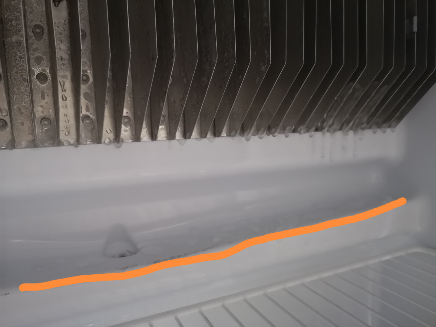 Kysymys, oletteko tehneet jääkaapin sisälle reunaa (kuvan oranssi viiva)? Esim P-ikkunatiivisteellä tai elintarvikelaatuise