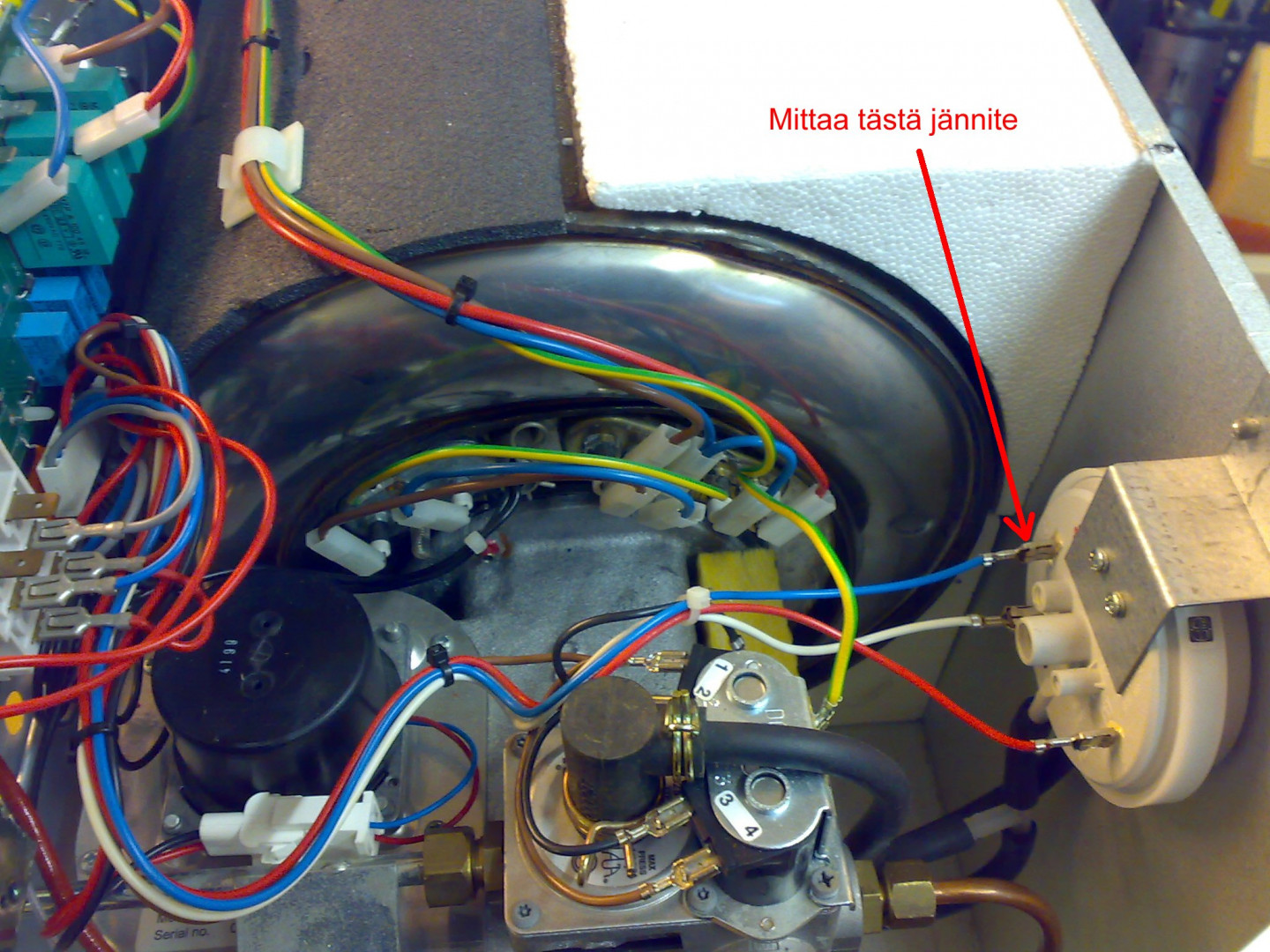 Kun testaat, että jääkö kaasuventtiili päälle niin kaasupullo kiinni ja käynnistät pannun, pidä kädellä kiinni kaasuventtiilistä niin tunnet kun se vetää ja päästää. Jos jännite häviää venttiilin navoista, mutta kaasun hajua tulee niin kaasuventtiilin mäntä saattaa takellella. Kaasuventtiili kuvassa keskellä alhaalla. Kuvan teksti ei kuulu aiheeseen.