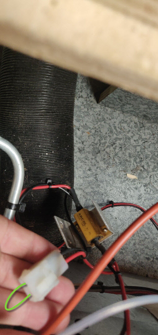 Eli musta johto ohittaa tuon mötikkän ja menee liittimeen. Punainen johto menee tuohon mötikkään ja siitä mistä menee tulee pois musta johto. Tämä musta johto menee tuohon liittimeen mikä ei mene minnekkään yhdessä toisen punaisen johdon kanssa joka löhtee mötikästä. Ja tuo ohittava musta johto menee Alden kylkeen yhdessä toisen punasien mötikästä lähtevän punaisen johdon kanssa.