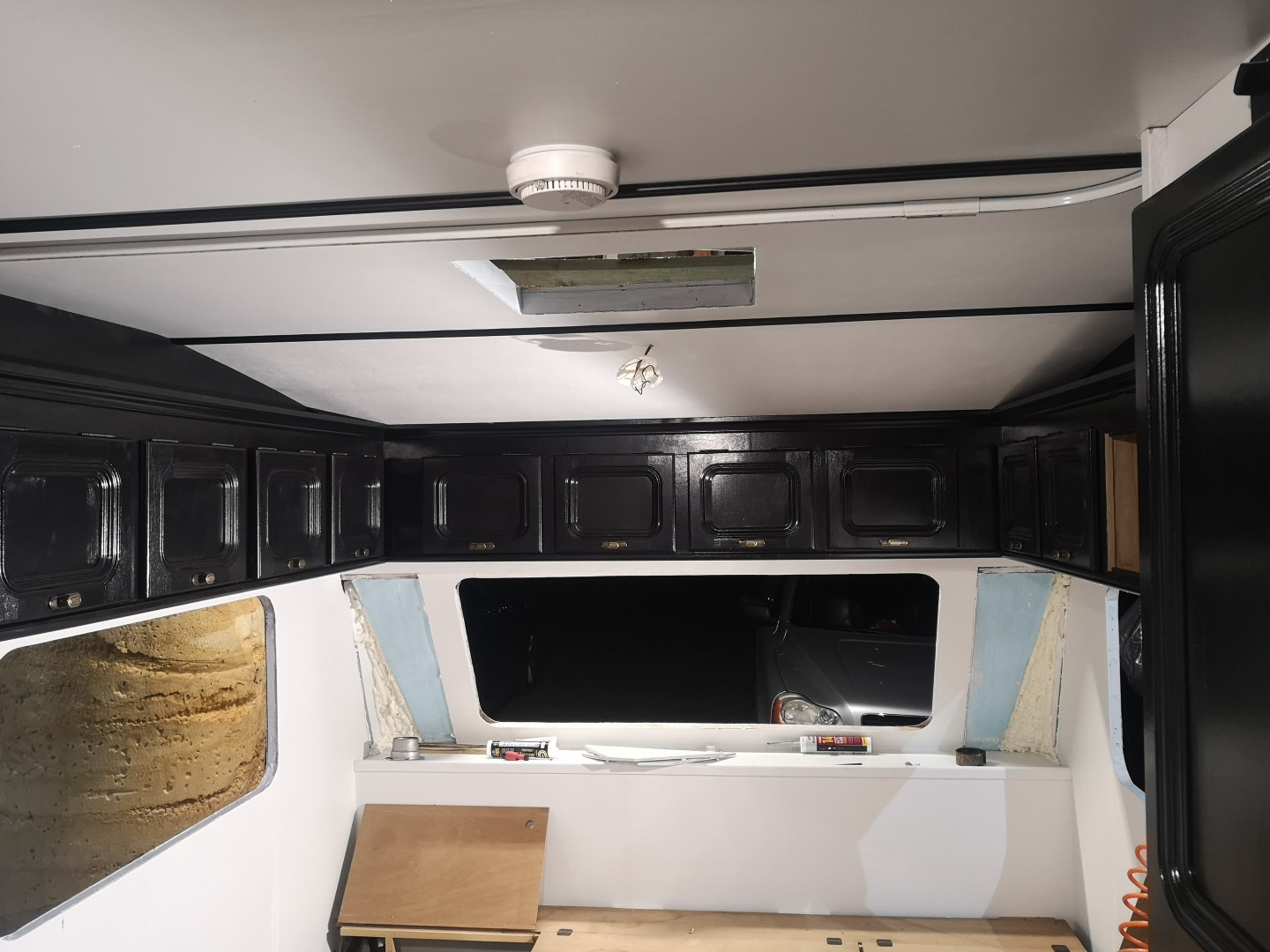 Ikkunoita tuossa tuskaillu paikalleen, on se mukavaa tuo butyylimassa. No enää ei ole ku etu- ja takaikkuna ku kattopelti vielä laittamatta paikalleen, se kun tulee kummankin ikkunan yläsauman alle. Vähän huonot ilmat maalailla ja liimailla ku lämpötila vajaa kymppi ja vettä taas vaihteeksi tullu koko ajan niin ei mikään kuivu tai tartu kunnolla. Taidan nakata kattopellin kiinni ja viedä tuon lämpimään loppuhipistelyjä varten, muuten ei homma edisty.