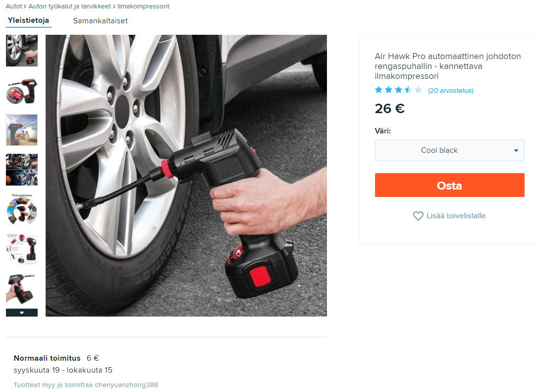 Kuvissa Saksalaisen auton 12V:n kompura jossa kivat luvut paineille mittarissa jonka verme lupaa aikaan saada . . . Liekkö noihin kinuski kauaa pystyy . . . Tuollainen on asuntoautossa mukana vararenkaan lisäksi, tietty vielä löytyy tollanen hätäapupakkaus ( tosin ei Puuilon versio ) : https://www.puuilo.fi/RENKAANKORJAUSSARJA . Vararengas on ainut joka painaa ja vie tilaa, kompura ja korjaus-sarja sensijaan ei häirihe painon/kokonsa suhteen . . . ![]() ![]() |