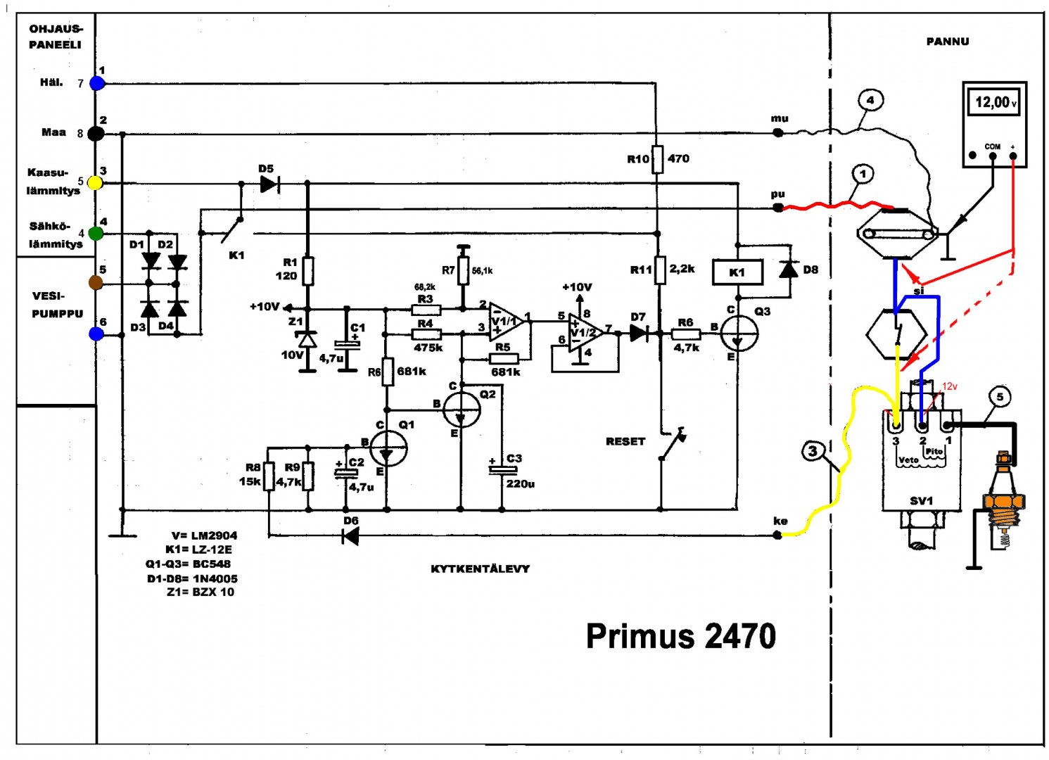 Hei. Siis kyseessä primus 2470 pannu. Eli lämpiää pannun ns. Tavoite lämpöön ja pannun termostaatti katkaisee lämmityksen jottei keitä. Sisä lämpötila ei vielä säädetyssä. Kun pannu sammuu syttyy sisälle kolmio valo, kun kaasun katkaisijaa käyttää kiinni saa saman toistumaan. Eli pumpu ei jää kierrättämään nestettä. Olen kokeilit eri pyrostaatilla, syttyy hyvin mutta sammuu melkein heti ja pumpu jää päälle. Pyrostaatille menevät johdot kun yhdistää pannu palaa\syttyy molemmilla kokeiluilla pyrostaateilla. Pumppu siis ainakin kunnossa, ja termostaatti. Se viellä että jos pannun ollessa päällä termostaatilta pannusta ottaa punaisen tai sinisen johdon irti pumpu jää päälle. Samoin jos keltaisen johdon ottaa pois pumppu jää päälle. Sähkö vastuksella lämpiää vaunu kyllä. Perusjutut testattu ja myös mitä näiltä sivuilta löytynyt. Onko pannun kyljessä oleva boksi rikki? Lähtee muuten vikatilassa myös päälle kun kuittaa pannun vikakytkimestä. Pannuun on asennettu kipinä sytytys ja toiminut sen kanssa hyvin vuosia. Vaunu kävi korjaamossa, mutta kun liike oli minulla jo kolmatta pyrostaattia maksattamassa lopetin heidän hommat siihen.