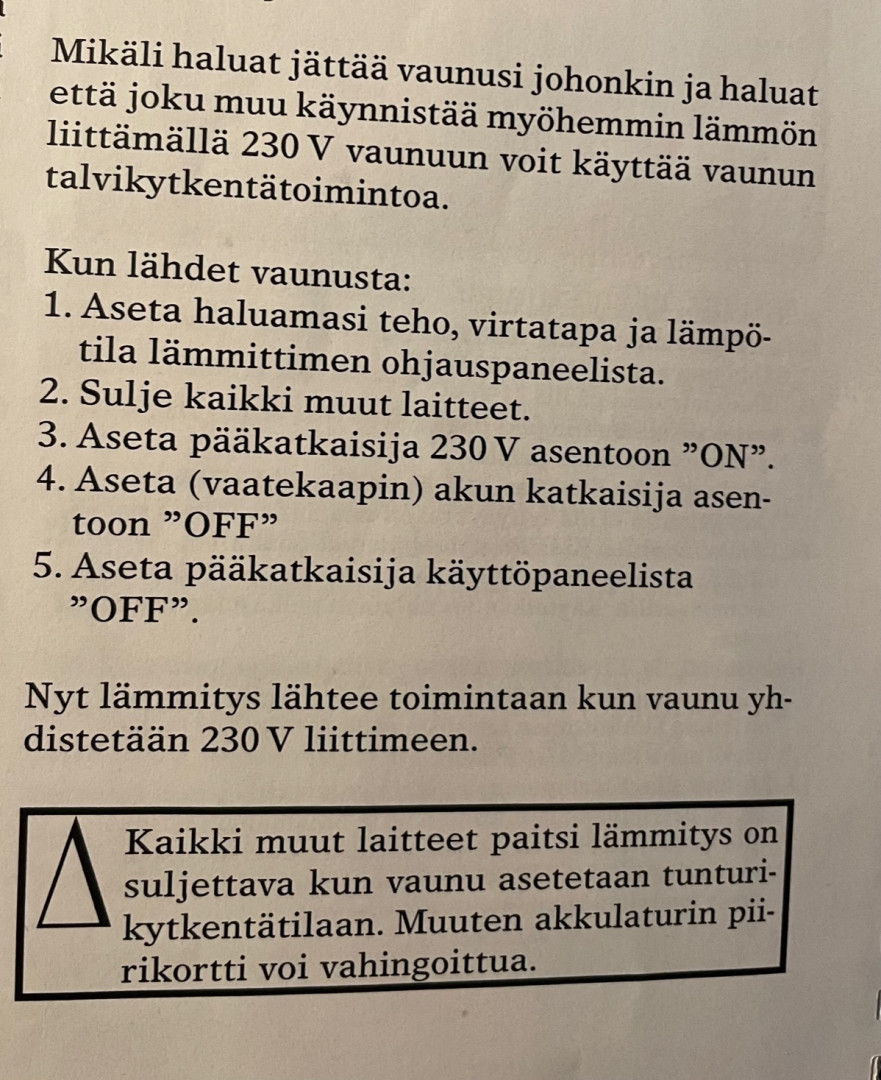 Kaikki muut laitteet paitsi lämmitys on suljettava kun vaunu asetetaan tunturikytkentätila an. Muuten akkulaturin piirikortti voi vahingoittua"