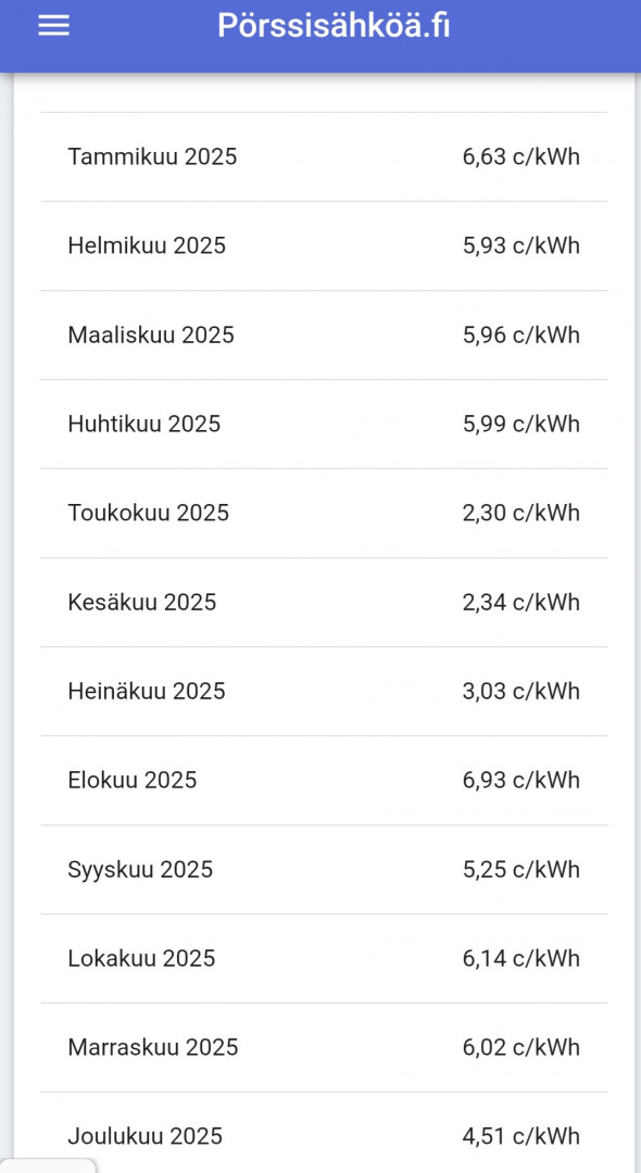 Tässä vuoden 2025 kuukausien keskihinnat.