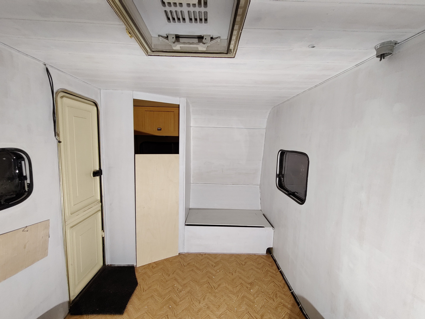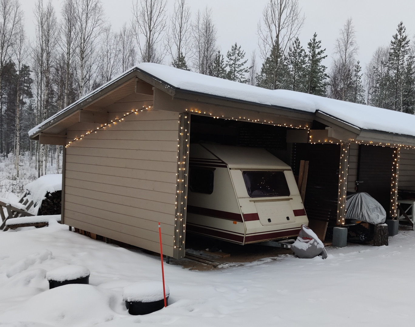 Hyvissä ajoin jo kesällä, kun päätimme alkaa antamaan uutta elämää vanhalle vaunuvanhukselle, rakensimme sille "uuden kodin". Vaunu on vesi- ja lumisateilta suojassa, mutta pakkanen on otettava huomioon töitä tehdessä. Nyt on remontti sillä tavalla hyvässä vaiheessa, että kovimpien pakkasten aikaan voidaan lämmitin sammuttaa ja keskeyttää työt ja ootella lämpimämpiä ilmoja. Lämmönlähteenä on 2 kW rakennuspuhallin. Kun lämpötila laskee noin 15 asteen pakkaselle, on parempi pysytellä työmaalta pois ja keskittyä tulevien työvaiheiden suunnitteluun. Kun maalasin tuota kaasupullokoteloa, niin panin merkille, että maalauksessa syntyy runsaasti kosteutta vaunun sisälle. Vähän kiirettä piteli saada maalaukset tehtyä ennen kuin pakkaset alkoi kiristymään. Nyt vaunussa on sisälläkin ulkolämpötila, eli reippaasti pakkasta! Nyt aletaan suunnitella kalusteita. Kalusteiden sijoittelu on jo valmiina. Tarkoitus on tehdä kaikki kalusteet itse. Materiaaliksi on valikoitunut 12 mm koivu- tai havuvaneri. Tuollainen kuvan mukainen pinnoitettu vaneri on harkinnassa. Jos vain Teillä kellään on kokemuksia yleesäkin kalusteiden tekemisestä ja materiaalivalinnois ta, niin mielellään lukisin kommentteja ja neuvoja.  Kaasupullokoteloa pienennettiin leveyssuunnassa noin 400 mm. Näin saatiin molemmille sivuille tuleville sängyille kätevästi lisätilaa.  Tälle seinälle tulee ikkunoiden väliin oikealle puolelle henkarikaappi ja sen viereen vasemmalle puolelle jääkaappi pöytätason korkeudelle, niin ei tartte sitten kyykistellä lattiatasolle. Ilmanotto tulee lattiassa olevan vanhan lämmittimen ilmanottoaukosta. Poisto tulee samoin vanhan lämmittimen pakoputken kautta. Saa sitten nähdä toimiiko miten. Varasuunnitelmana on tarvittaessa lisätä yläosaan putken suulle puhallin ja vielä tarvittaessa ruveta tekemään aukko seinään. Vasemman puoleisen ikkunan kohdalle tulee noin 700 mm leveä keittotaso + allas. Takaosaan nurkkaan jää alkuperäiselle paikalle akku ym. sähkölaitteet. Muutamia vetolaatikoita sijoitetaan sopivasti tälle alueelle. Takaosaan laitetaan vesisäiliö. Vessaan tulee porttipotan tilalle kasettivessa, sille löytyi hyvä sijoitusratkaisu.  Oven vasemmalle puolelle laitetaan Truman S 2200 pistelämmitin. Ilman otto tulee lattiasta ja poisto seinällä kuvassa näkyvien jomman kumman aukon kautta. Lämmittimen vasemmalle puolelle saadaan vielä yksi kaappi, jonne laitetaan lankakorit oven taakse. Etuosaan tehdään erilliset sängyt 700 mm x 1800 mm. Isompia ei voi tehdä, mutta noilla kyllä pärjätään. Näillä näkymin yläkaappeja ei laiteta ollenkaan. Etosaan sänkyjen väliin tulee kiinteä pöytä, joka lähtee kaasupullokotelon seinästä. Kotelon kannen päälle laitetaan kaareva vaunun sivuille kapeneva taso. Etuosaan katon keskelle pöydän päälle tehdään alaslaskettu katto noin 20 mm välillä katosta. Tarkoitus on laittaa tähän ledejä ja lähelle ulkoreunoja led-nauha, joka antaa epäsuoraa valaistusta kattoon ja seiniin. Tällaiset on suunnitelmat. Muutaman kuukauden päästä sitten nähdään, miten suunnitelmat ovat toteutuneet  Tällainen vaneri on suunnitelmissa kalusteiden runkomateriaaliksi. Tätä ei tarvitse pintakäsitellä. Toinen puoli on valkoinen ja toinen puoli harmaa. Sisus on havuvaneria. Onko kellään kokemusta tämän käytöstä yleensäkin.