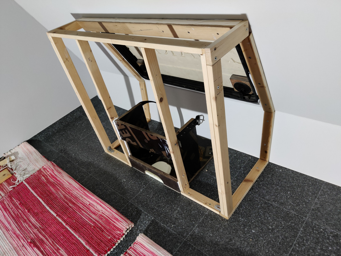 Kovia ennustettuja pakkasia odotellessa, pitää yrittää tehdä vaunu mahdollisimman lämmönpitäväksi. Sain nyt tuon kaasupullokotelon levytettyä tuolla Tycroc-levyllä. On muuten mahtava materiaali, jos on tarvetta saada jäykkyyttä rakenteeseen. Leikkaus onnistuu parhaiten kuviosahalla (puuterällä) ja liimauksen olen tehnyt Sikan 221 massalla. Tuossa on sitten hyvä pohja laittaa vanerit päälle.  Levyjen liimaus vaatii malttia, kaikkia kappaleita ei voi liimata samalla kertaa. Ilman noita pikavingoja työ olisi huomattavasti hankalampaa, tai ainakin joutuisi käyttämään ruuveja. Sekin kyllä onnistuu tuohon materiaaliin sellaisilla leveäkantaisilla levyruuveilla, jotka voi sitten poistaa liimauksen jälkeen, niin eivät jää sitten "kantamaan" vanerin alle.  Vippaskonsteja joutuu käyttämään, joka paikkaan ei vingat sovellu ja laudoilla ja erilaisilla puupalikoilla saa isommalta alalta tuennan levyyn.  Levytys valmiina vanerointia varten