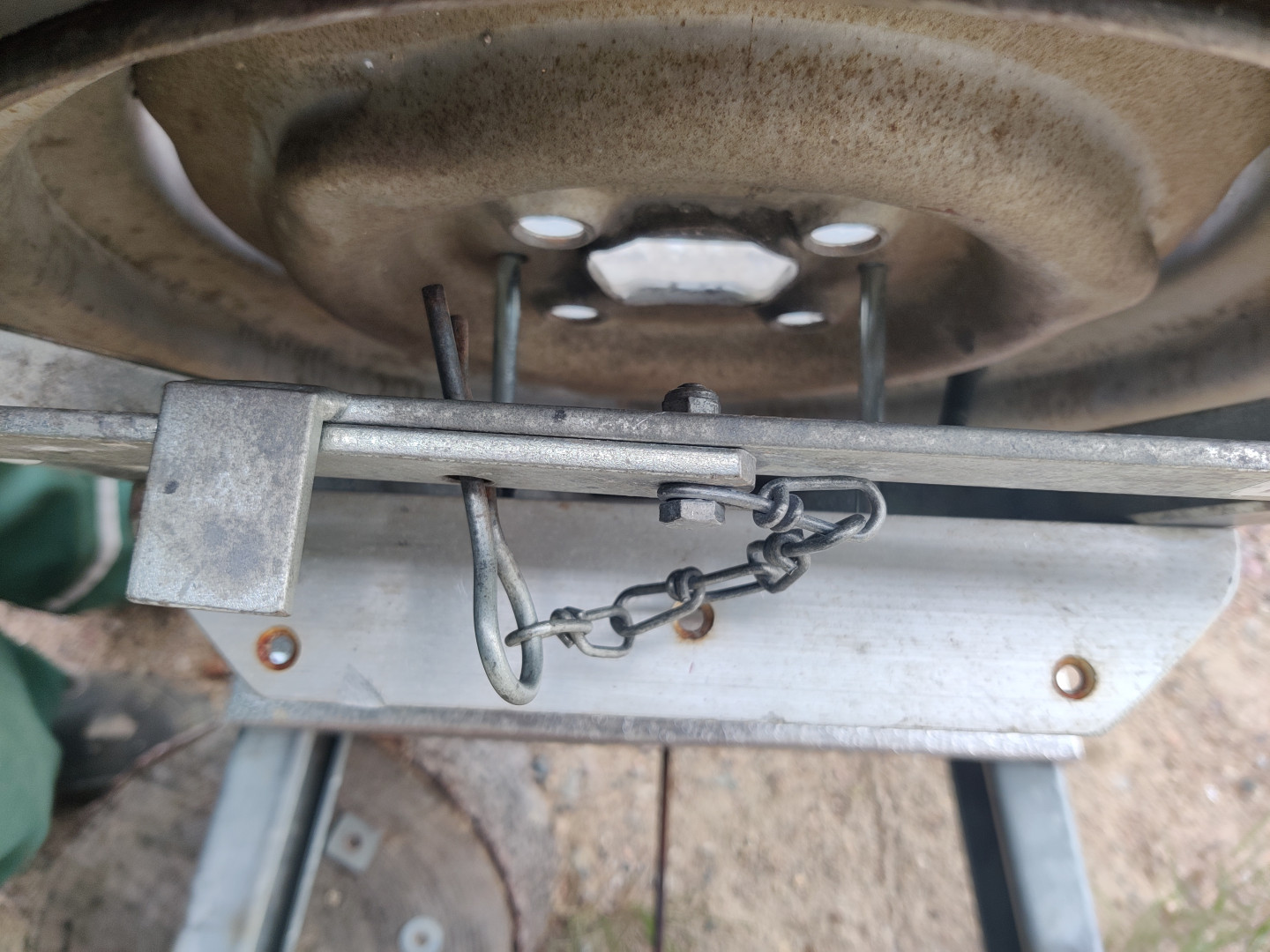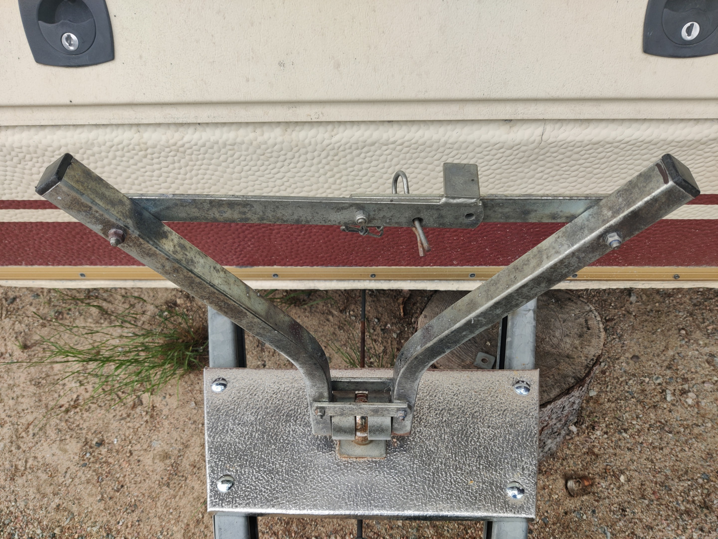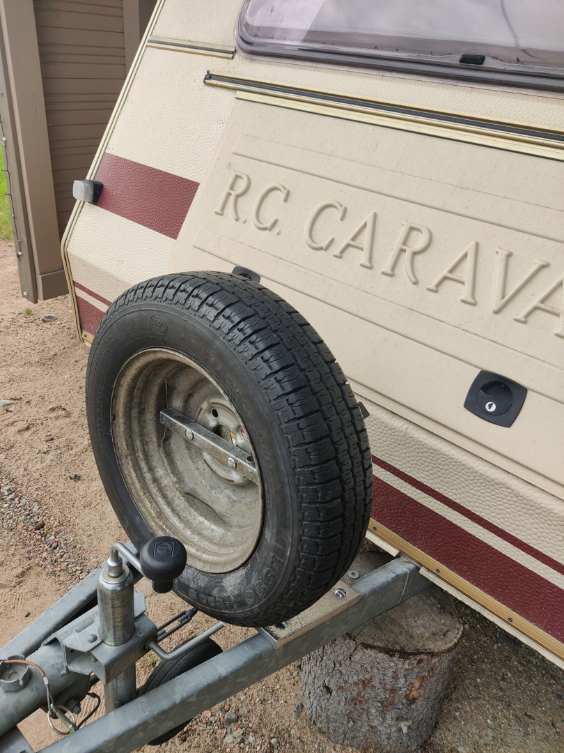 Kun on tuota joutilasta aikaa, niin ajattelin värkätä tuohon vaunun aisan päälle uuden vararenkaan kiinnityssysteemin. Edellinen kuulanupin kiinnityslauta oli tosiaan jo aika pehmyttä puuta ja heiluikin jo uhkaavasti. Ensin ajattelin laittaa uuden rst-suorakaideputkesta, mutta sellaista ei löytynyt itseltä eikä lähialueen kaupoistakaan sopivaa pätkää. Joten muutin suunnitelmaa ja päätin vaihtaa materiaalin 15 mm:n muottivaneriksi, josta voinkin tehdä sitten leveämmän ja neljällä ruuvikiinnityksellä aisaan. Muottivaneri ei ole erikoisen kaunis tuossa kohtaa, joten päätin "päällystää" sen varastosta löytyvällä stuccolevyllä. Ajattelin, että pitäähän sen kuitenkin olla fiksumman näköinen  Vararenkaan kiinnitystä varten tein telineen vanhasta joutilaasta polkupyörätelineest ä. Nyt vararengas kulkee mukavasti ja turvallisesti mukana   Tämä oli jo "aikansa elänyt"  Eiköhän tämä kestä niin kauan kun tällä vaunulla matkaa tehdään  Pienellä muutoksella vanha pyöräteline sai uuden "tehtävän"  Renkaan kiinnitys onnistui kahdella vanteen reiistä läpi laitetulla M8 ruuvilla+lukkomutterilla  Ei mahottoman kaunis, mutta toimii