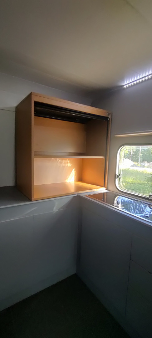 Kun aikoinaan -21 alkukesästä saatiin Retro valmiiksi, tuntui silloin siltä, että siinä on nyt kaikki mitä tarvitaan. Mutta aina vaan näyttää syntyvän uusia tarpeita. Pidemmillä reissuilla tarvitaan tavallista enemmän esim. vaatteille, astioille ym. tilaa. Ja minulle vessan ahtaus toi uusia ajatuksia, miten saisi lisää tilaa pytyllä istumiseen. Alkuperäisessä Retrossahan oli vain PorttaPotta ja tässä uudistetussa on ihan oikea kasettivessa, mutta tosi pienessä tilassa. Siitä lähti ajatus viriämään, josko muokataan tuota oven muotoa. Niinpä piirsin uuden oven muodon lattiaan ja laitoin eräälle muovikaupalle tarjouspyynnön esim. 3-5 mm:n akryylilevystä taivutetusta ovesta. Sävynä jokin savunharmaa, jolloin "intiimiys" säilyy pytyllä istuessa. Jos tämän ratkaisun hinta nousee "pilviin", sitten pitää miettiä vastaavaa ratkaisua 2-3 mm:n alumiinilevystä, jonka ulkopintaan voisi teettää kauniin luontokuvateippauks en ja sisäpuolelle vaikka vain kalusteisiin sopivasti sointuvan tasavärisen teippauksen. Tavaroiden säilytykseen lisätilaksi tuohon takaseinälle olen jo aiemminkin miettinyt kalusteiden tekemistä, mutta sitten heräsi ajatus, miten rulokaappi soveltuisi tuohon tilaan. Niinpä Torin syövereistä löytyi edullinen ja sopivan mittainen kaappi, josta saadaan tuunattua tuohon paikkaan sopiva. Kaappia pitää mataloittaa, siten, että siitä tulee noin 550 mm korkea, muuten se istuu tuohon paikkaan hyvin. Toki, pitäähän se maalata samaan sävyyn kuin seinät on maalattu. Sen verran pääsi helleilmat "säikäyttämään" tuon viimeisen reissun loppuvaiheessa, että tuli mieleen, mitä voisi keksiä asiaan parannusta. Säälitti katsoa rouvaa perunan keittopuuhissa, kun vaunussa oli todella kuumat oltavat ja ulkona seisova ilma. Mitään kalliita tuhansien ilmastointilaitteit a tai muitakaan "jäähdyttimiä" ei kannata lähteä investoimaan lähes 40 vuotta vanhaan vaunuun. Niitä hellepäiviä ei kuitenkaan ole kuin muutama kesässä ja ollaanko just silloin reissussa. Mutta jotain kuitenkin. Yhden tietokoneen puhaltimen aiemmin asentaneena jääkaapille, ajattelin katsella puhaltimen, teholtaan noin 100-120 kuutiometriä/tunti, jolla saadaan ilma vaihtumaan vaunussa noin 4-5 kertaa tunnissa. Toki säädin pitää laittaa väliin, jotta ilmanvaihdon tehokkuutta voidaan säätää. Uskon, että tämä on meille ratkaisu ongelmaan. Puhaltimen kiinnitän nykyiseen kattoluukkuun. Korvausilmalle on valmiina seinässä aukko lämmittimen takana, ja jos tämä ei riitä, avataan sitten ikkunaa avuksi  Näissä sitä onkin joksikin aikaa taas värkkäämistä    Pienikin lisätila joskus saattaa olla ihan hyvä    Tässä vaiheessa näyttää vielä kovin kookkaalta, mutta eiköhän se siitä muutu, kun päästään sahan kanssa hommiin ja lopuksi maalataan sopivaan sävyyn.  Tuosta aukkolevystä poistan nuo välit , ja teen yhtenäisen aukon. Tueksi kiinnitän 2 mm:n akryylilevyn, jossa puhaltimen vaatima aukko. Puhallin tulee neljällä ruuvilla+mutterilla kiinni akryylilevyyn. Virtajohto tulee jääkaapin yläpuolelta ja kytkimen voi laittaa vaikka kattoon.