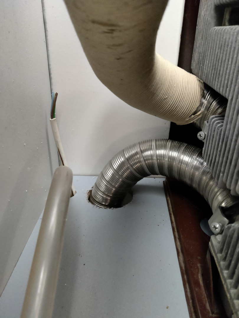 Näin olisi tarkoitus asentaa uusi kaappi.  Palamisilma tulee lattian aukosta 100mm:n taipuisaa letkua myöten kaapin alaosan tasolle kaappia kannattavan tason läpi.  Mahdollinen kaasuvuoto pääsee valumaan samaa putkea myöten ulos.  Palamiskaasut ja syntynyt lämpö poistuvat katossa olevan joutilaaksi jääneen Truman pakoputken aukosta.  Pitäisi toimia hyvin.  Jos ei toimi, eli välitilassa ei ilma vaihdu riittävän tehokkaasti, olen ajatellut ensimmäisenä vaiheena lisätä välitilan yläosaan pienen puhaltimen tehostamaan ilmanvaihtoa.  En haluaisi alkaa tekemään kattoon reikää, mutta sekin saattaa tulla kyseeseen,jos nykyinen pakoputken läpimitta osoittautuu liian pieneksi.