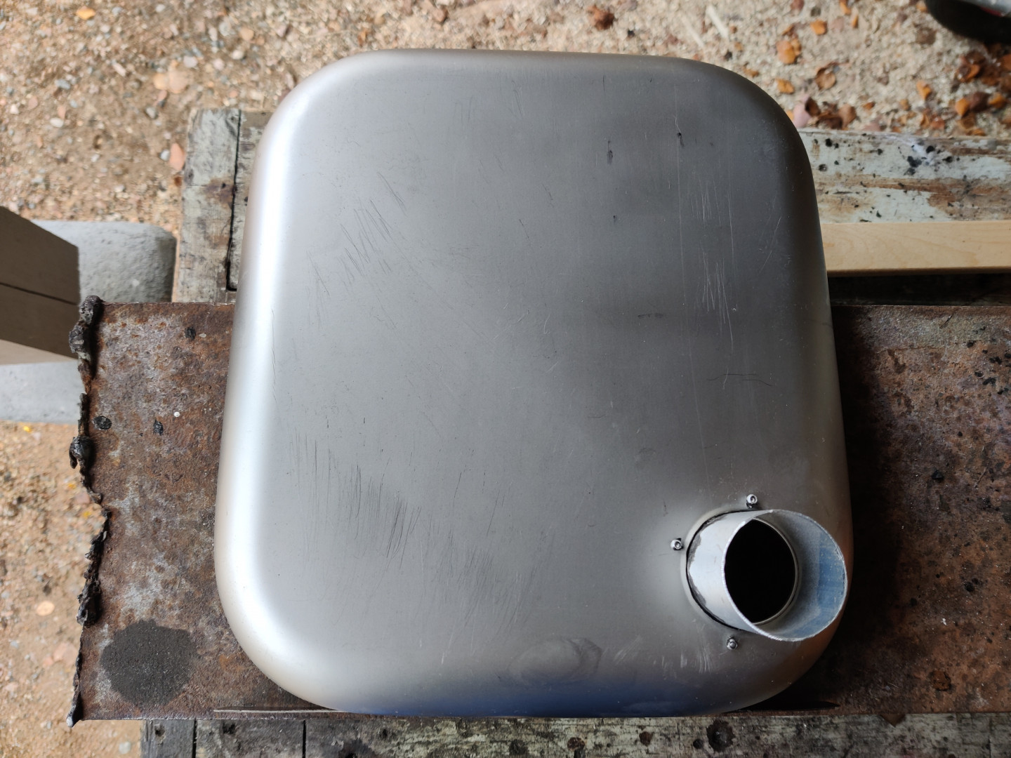 Lähtökaulusmateriaa li löytyi tuulen rikkoman aurinkovarjon alumiiniputkesta.  Koska alumiinista lähtökaulusta ei voinut kiinnittää hitsaamalla rostelilevyyn, piti kehitellä muunlainen kiinnitys.  Tähän piti löytää sopiva reiällinen laippa kotelon sisäpuolelle.  Tätä varten piti tyhjentää vajaa asetonipurkki.   Purkin yläosasta tuli juuri sopiva laippa tähän tarkoitukseen.