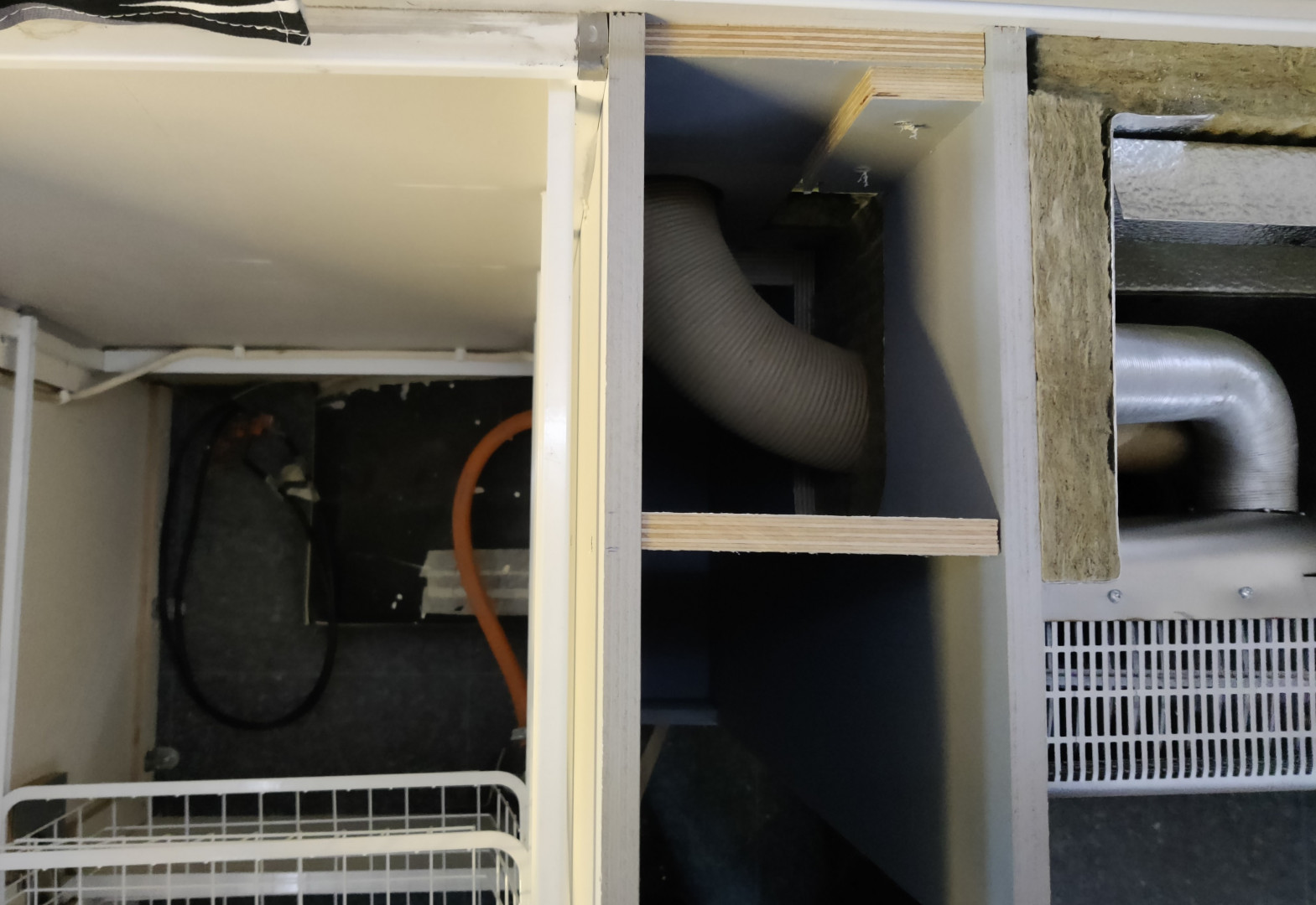 Lämmittimen kohdalla oli alkuperäisessä versiossa jääkaappi ja tämä aukko on kaapin taakse syntyvän lämmön poistoon.  En ole laittanut aukkoon vielä mitään. Tällä käyttökokemuksella aukosta tuleva raitis ilma, lämmittimen päällä ollessa, sekoittuu hyvin lämpimään ilmaan.