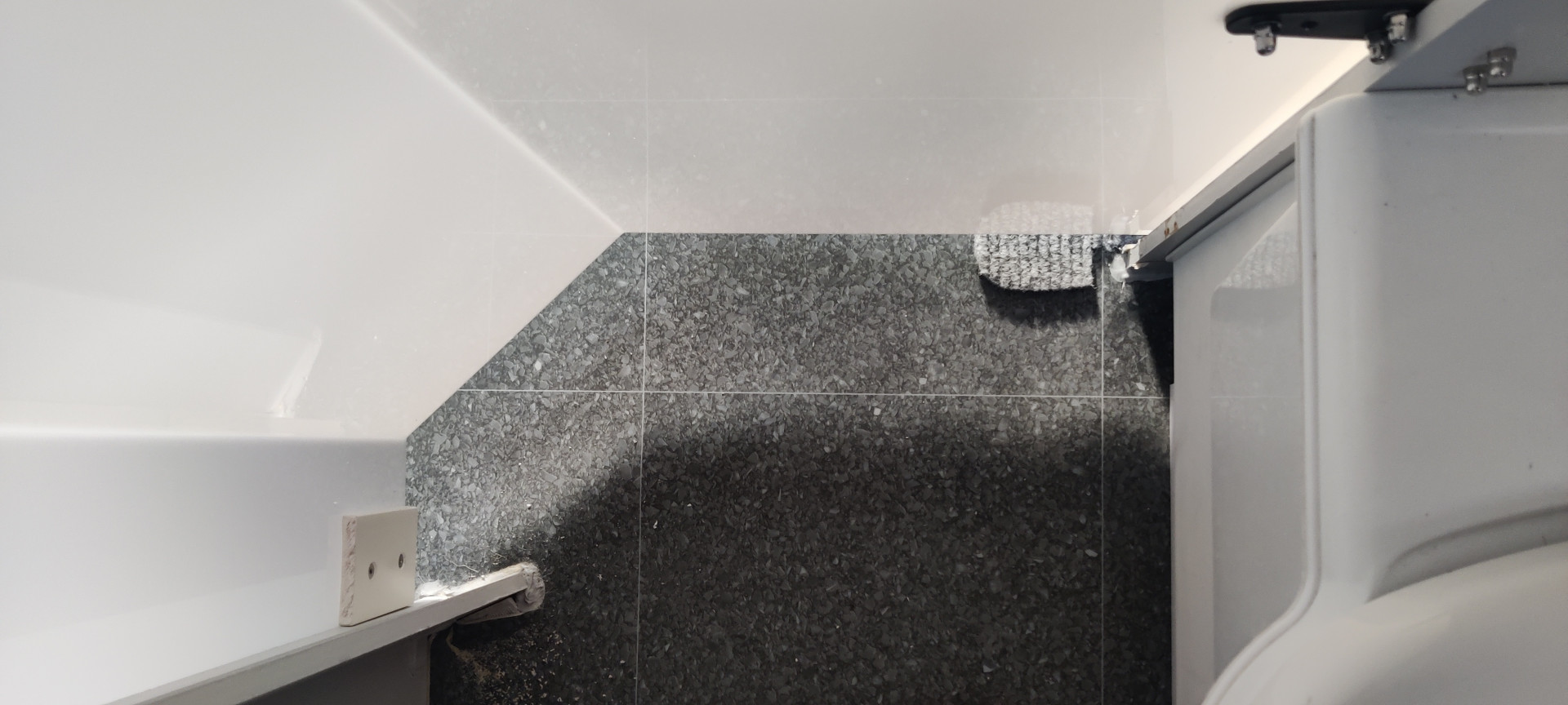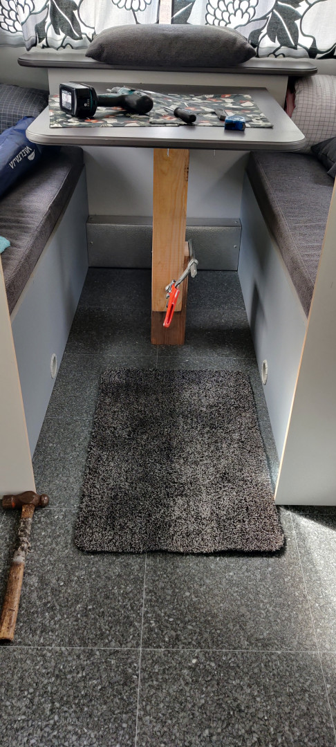 Pöytä sai uuden jalan. 60 mm:n rst-putken alapäähän hitsasin noin 8 x 60 kansiruuvilla varustetun laipan. Ruuvin hitsasin etukäteen laippaan, joten ruuvin kanta jäi putken sisään. Putken yläpäähän hitsasin poikittain päistään viistetyn 33 mm:n rosteriputken. Onneksi pöytäkantta voitiin nostaa sen verran, että sain alapään ruuvin soviteltua lattiaan porattuun sopivan kokoiseen reikään. Sitten vaan putkea pyörittämään latian tasoa vasten. Yläpää kiinnitettiin kahdella puuruuvilla pöydän alapinnassa olevaan poistetun kaapin vanerilevyyn, joka jäi onneksi paikalleen tason alapintaan. Nyt mahtuu jalat pöydän alle hyvin ja kaikin puolin ratkaisu on nyt paljon parempi  Ovikin on tulossa ja saamme sen hakea kuljetusfirman terminaalista ensi viikon maanantaina.
