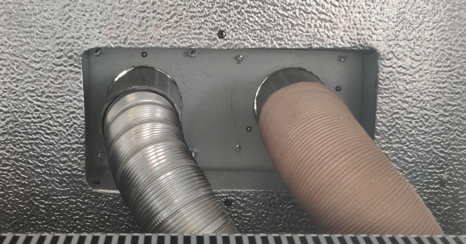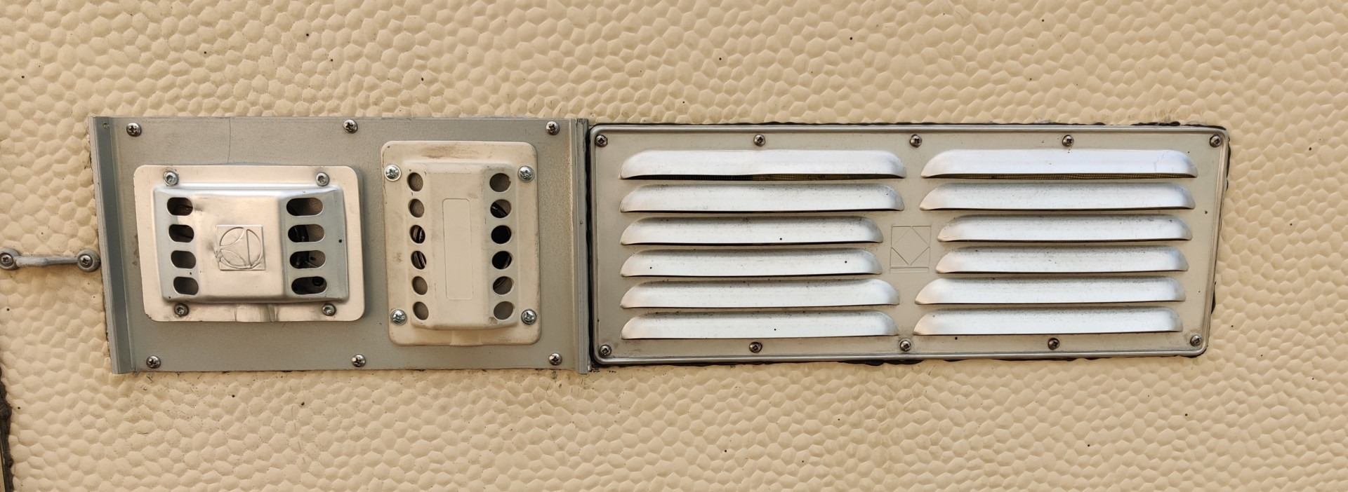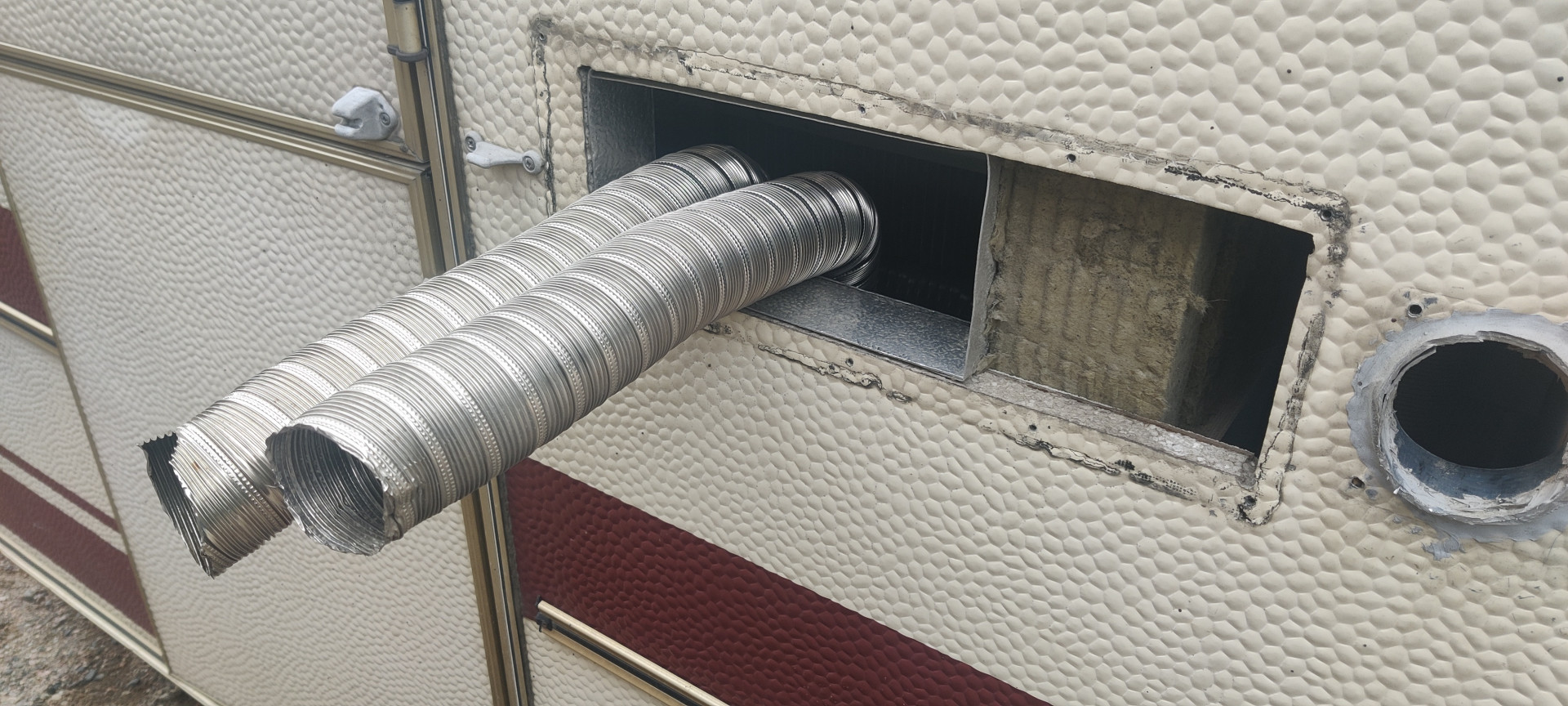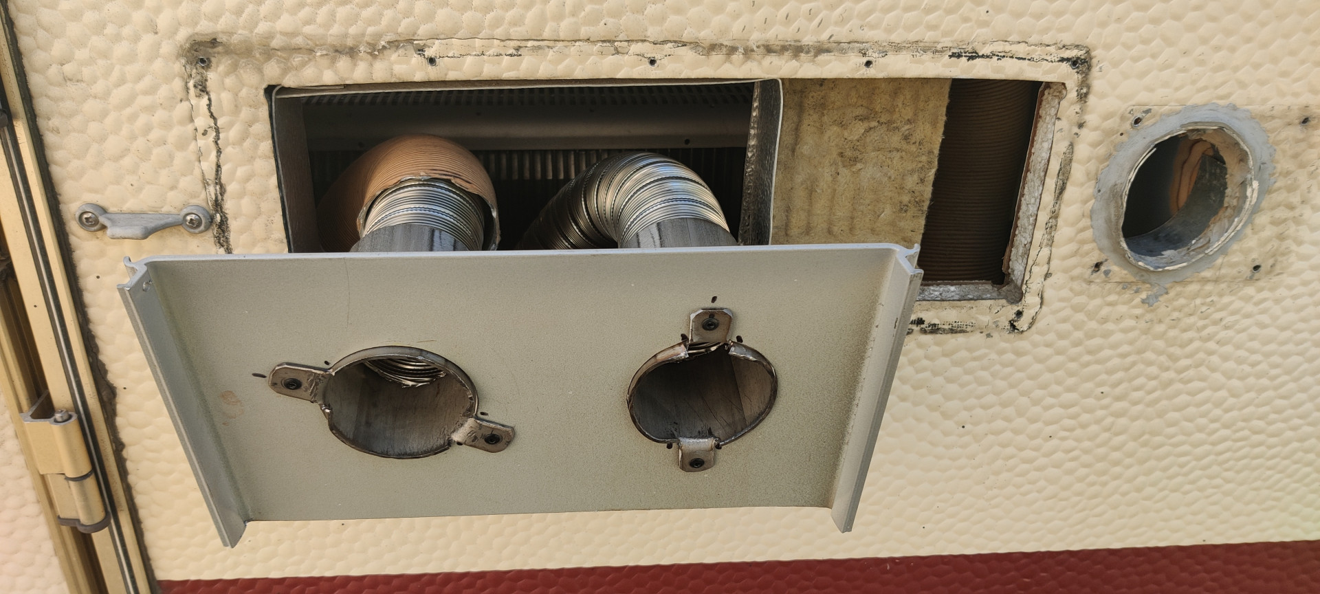 Nyt on putket paikallaan Truman ohjeiden mukaisesti... melkein. Laitoimme putket peräkkäin samalle korkeudelle. Noin oli paljon helpompi laittaa, kun oli tuo aukko sopivasti kohdallaan ja riittävän kokoinen. "Miljoonavarastosta", johon on kertynyt kaikenlaista metallia eri muodoissaan, löytyi tuollaista 3 mm:n levyprofiilia. Ollut aikoinaan suihkukaapin taustaseinänä  Rasiaporalla tehtiin kaksi reikää rst-putkille, jotka niitattiin kahdella korvakolla levyyn. Nyt lämmitin käy ja kukkuu  Saa sitten nähdä, toimiiko kaikissa sääolosuhteissa. Kova hinku on lähteä vielä ruskaretkelle Lappiin, mutta vessan ovi pitää kuitenkin vielä asentaa paikalleen ennen lähtöä.  Kun on riittävän vanha vaunu, niin raskii tehdä näitä omia virityksia   Rst-putkinatsat tukevat hyvin putkia.  Ei mikään kaunis, mutta toimiva. Vasen on pakoputki ja oikea palamisilmaputki. Alumiinitilän alle jäi edellinen pakoputken reikä, tämä toimii vielä hyvin raitisilma-aukkona .