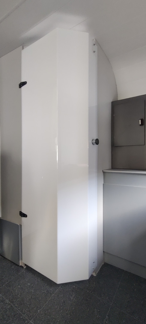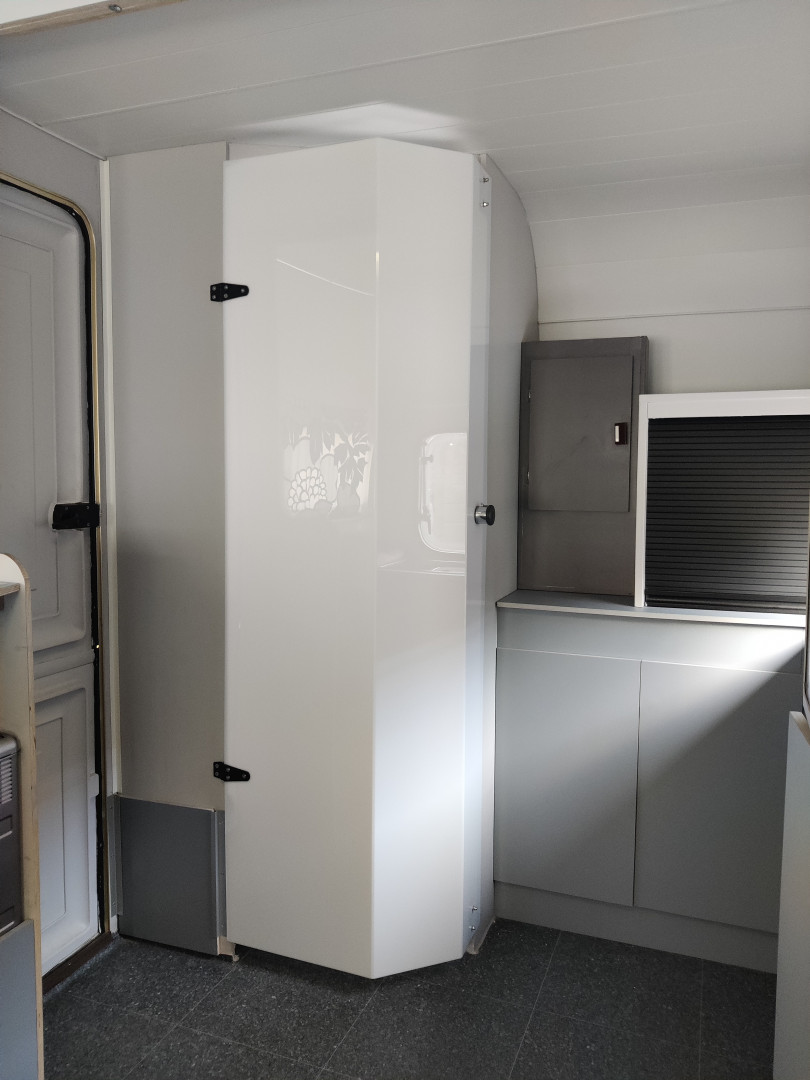 No niin, nyt mahtuu "isompikin ihminen" istahtamaan pytylle  Jalkatilaa tuli lisää huomattavasti. Aika työläs homma oli, mutta kannatti toteuttaa. Mittapiirroksen ovesta tein jo varmaankin liki kaksi kuukautta sitten. Ensimmäinen liike, jolta pyysin tarjousta, nosti ns. kädet pystyyn. Sitten lähestyin lahtelaista muovialan yritystä, josta sain tarjouksen seuraavana päivänä. Tilaus ja oven valmistus sujui ongelmitta ja ajallaan  Kuljetuksen hoiti rovaniemeläinen kuljetusyritys Oulun terminaaliinsa, josta haimme oven. Ovi oli pakattu todella hyvin kuljetusta varten. Tänään sitten tapahtui "hyviä asioita", eli asensimme oven paikalleen. Saranat löytyivät lopulta Bauhausista. Yhdestä ylimääräisestä saranasta leikkasin lehdet irti ja näin saatiin ovilevyn molemmille puolille tukevat saranalevyt. Ruuveiksi valittiin myös Bauhausista happoteräksiset uppokantaruuvit ja hattumutterit+aluslevyt. Salvan valinta olikin kinkkinen juttu. Oven muodosta johtuen, normaali rullasalpa ei tullut kyseeseen, koska ovi ikäänkuin liukuu lopulliseen paikkaansa seinää vasten. Kaksoiskuulasalpa tuntui parhaalta, ja sellainen lähtikin mukaan Puuilosta. Tätäkin piti itse vielä "jalostaa". Salvan etureunaan piti laittaa tukilevy, joka pitää oven paikallaan. Kaksipuoleinen lasioven nuppi löytyi omasta "miljoonavarastosta" Lopputulos on onnistunut  Nyt voisi sitten alkaa valmistelemaan Retroa tämän kesän viimeiselle reissulle (ehkä) Lapin ruskaa ihailemaan. Nyt ei otetakkaan kalavehkeitä mukaan, vaan nautitaan muuten vaan reissun päällä