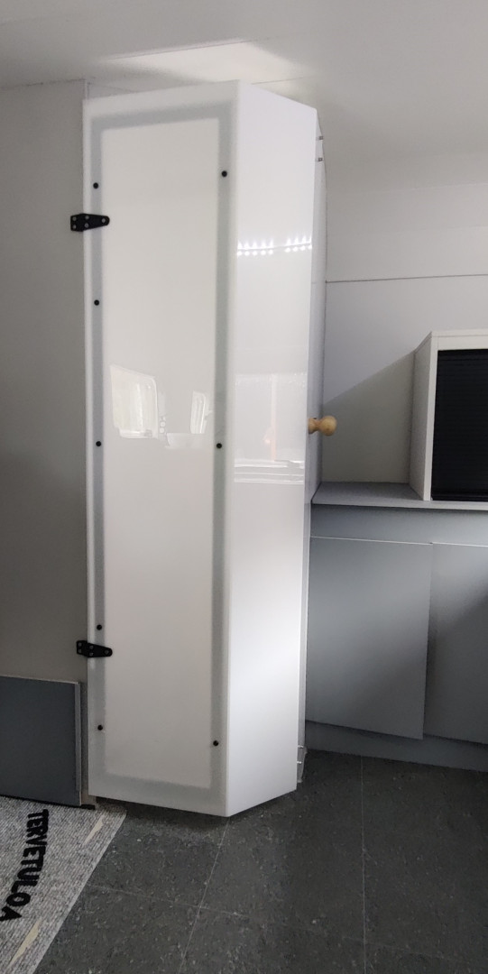 Pitää odotella ovihommaan tarjouksia muoviosaajilta ja katsoa, mitä voivat tarjota  Tänään tapahtui "hyviä asioita" eli saatiin madallettu ja kolmeen kertaan maalattu rulokaappi paikalleen. Rouva tykkää- pääsee seuraavalle reissulle sijottelemaan esim. kuivia ruoka-aineita ja keittohommissa tarvittavia tavaroita isompaan tilaan, kuin on tähän asti ollut käytettävissä. 160 km:n päästä piti hakea, mutta kun halvalla saatiin  Kannatti hakea kumminkin. Samallahan tuo oli sellainen sunnuntaiajelu.