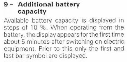 Näytössä on palkki (9), joka käsittääkseni kertoo akun varaustilan. Mitenkä se mahtaa tapahtua, kun se ei ainakaan korreloi näytössä olevan jännitteen kanssa?