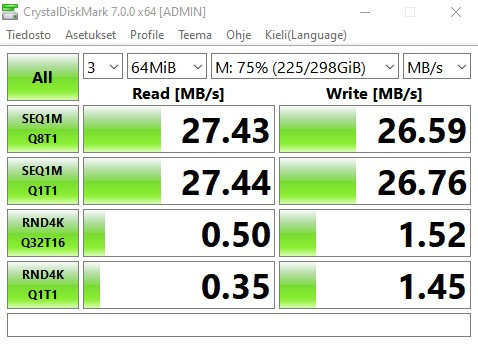 Aika hidas tuo HDD, oletko varma ettei se ole viallinen? Itse vein takuuvaihtoon kovan (4TB) jonka nopeus oli 50-80MB, kun luvattu oli reilusti yli 100MB (oli tosin muutakin ongelmaa levyssä). Nyt nopeus on HDD kovalla reilusti 100MB, mikä riittää hyvin omien tiedostojen säilytykseen.