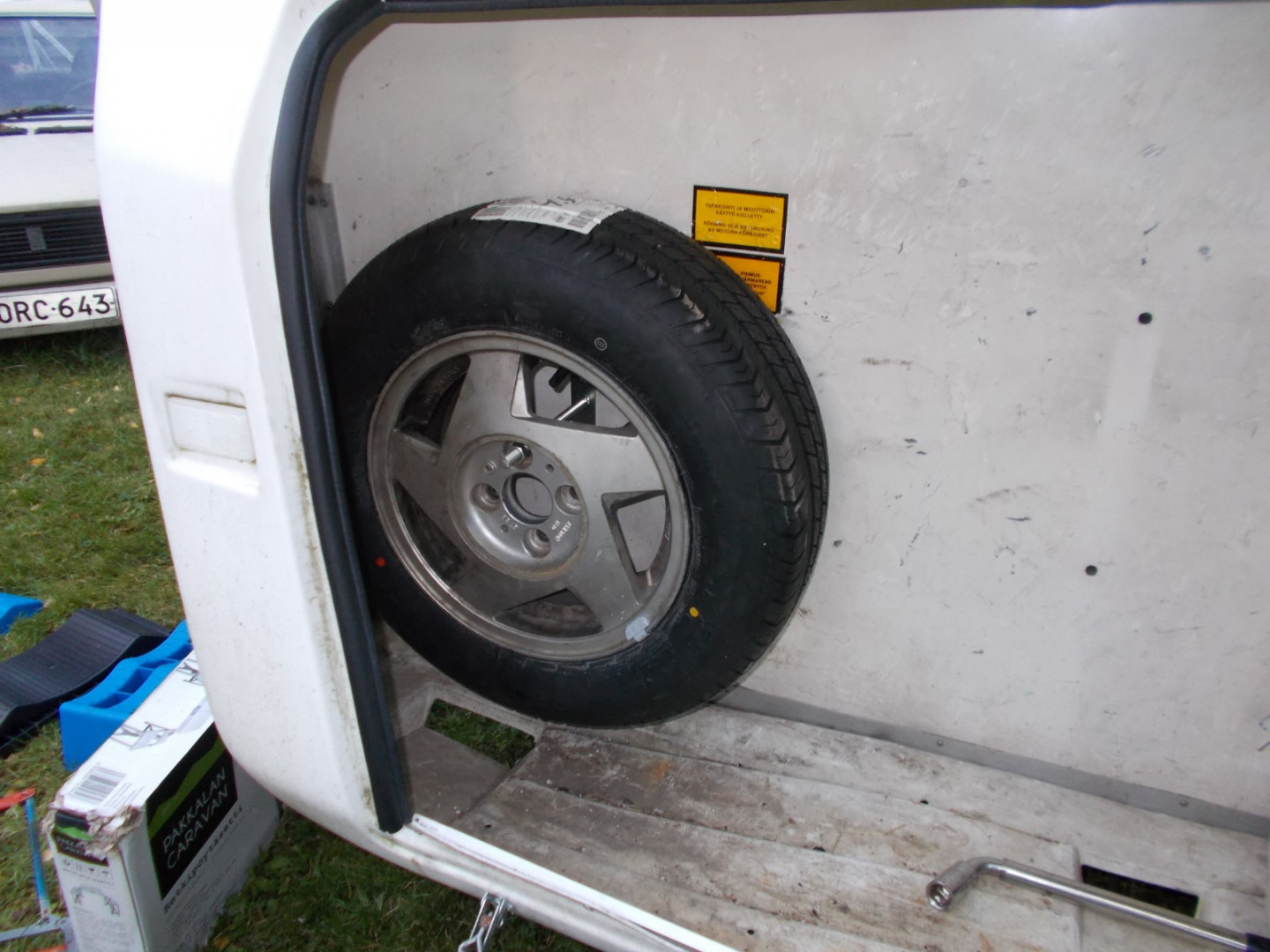 Ja tuossa samalla kun oli tuo pääty auki niin laitoin vararenkaalle telineen etuseinään. Muovipohja taipunu melko paljon jo alaspäin renkaan painosta.