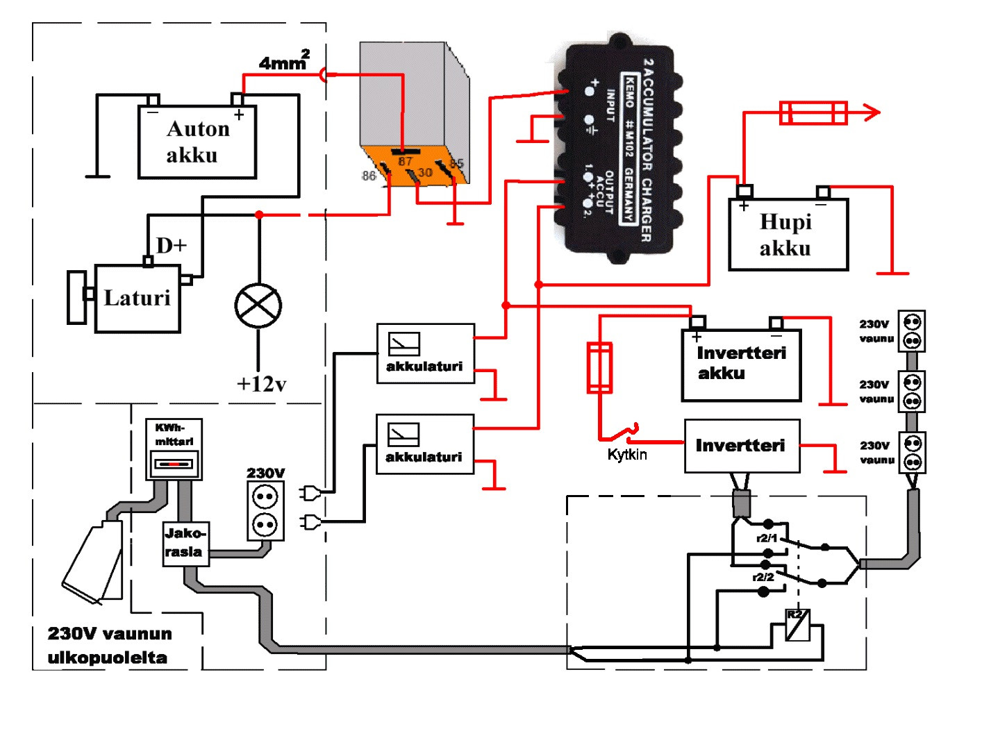 Empä tiijä miten hitekki tuommonen ametisti on mutta, ysäri vehkeessä oon auton invertterillä käyttänyt vaunun laitteistoo, vaunu syötön kautta, ja joskus tehny akkuun tilaa laittamalla vaunun invertteristä ,ikkunan raosta johdon vaunun sähkösyöttöön ja ajanu 1kw lämmitintä.