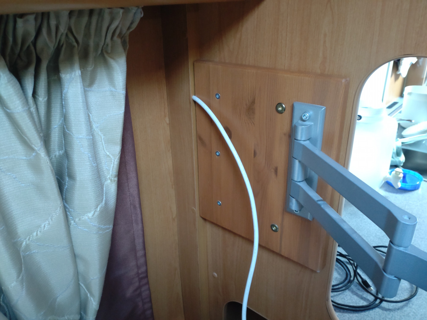 Vaunun mukana tuli 22 LG ja se on komeron seinässä kiinni pienellä aluvaluisella varrettomalla telineellä. Tuossa paikassa ei kaipaa vartta. Paikka muuten hyvä, mutta Primuksen termari on juuri TV:n jäähdytysripojen yläpuolella. Täytyy siirtää termari.