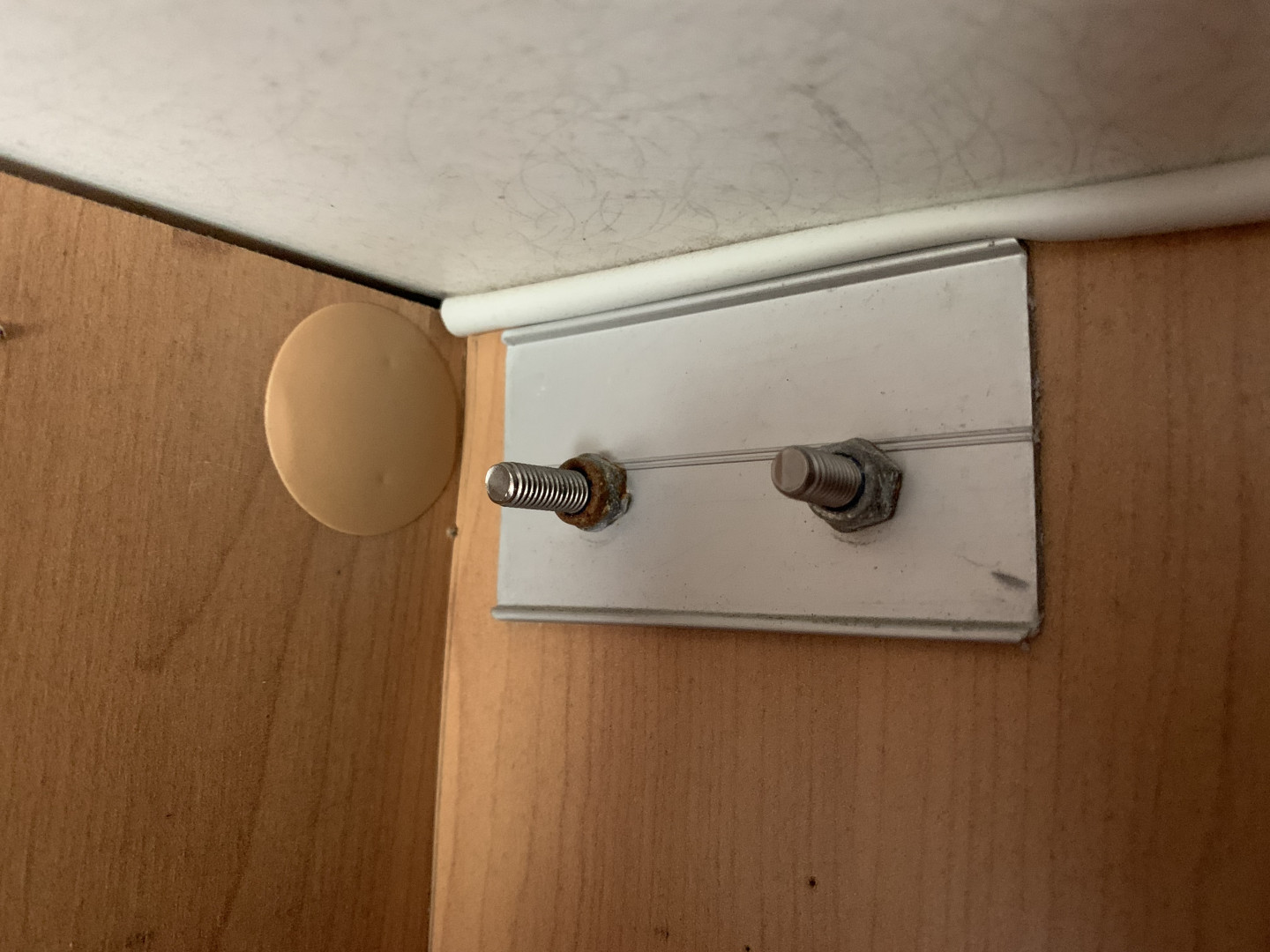 Tuon alumiinilätkän (kotelomarkiisin kiinnityksen painelevy) peitteenä sen kokoinen muovi kupu alkujaan. Vaan kun pultit toimivat kylmäsiltana - jäässä talvella kun tupa kuumana hönkijää. Ilman suojakupua kuivuvat paremmin ja hapettuminen hitaampaa. Minusta ei siis merkki mistää vuodosta.