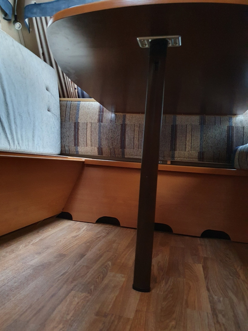 Pöydän jalka taittuu vain juurestaan, sen voi kääntää sinne pöydän alle. Ja nuo sivupenkit on tiukasti ruuvattu paikoilleen. Kaikki paikat on syynätty ja tutkittu, ja ainoa liikkuva osa tässä kokonaisuudessa on pöytä.