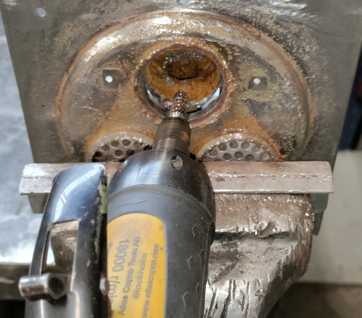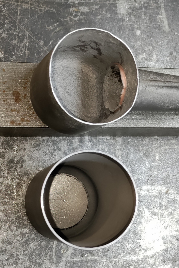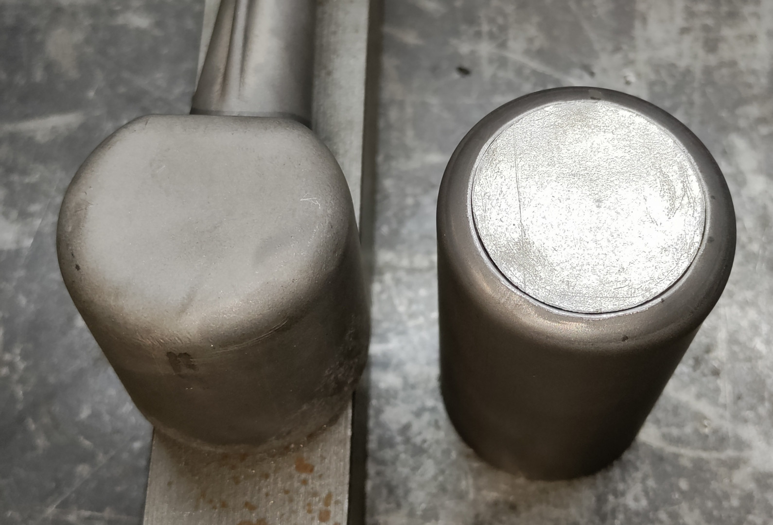 Ensin näytti että sen saisi pelastettua putkella jatkamalla suutinputken yläpuolelta. Puhalluksen jälkeen paljastui että on liian syöpynyt hitsattavaksi, paksuutta vain 0,4mm joissain kohdin. Löytyi 1mm seinämällä sopivaa vanhaa pöydän jalkaa ja 1mm peltiä, aloittelin tekemään muutamaa piippua. Putken alapäähän painoin prässillä 45 asteen sisäkartiolla supistuksen, johon sopiva lappu.