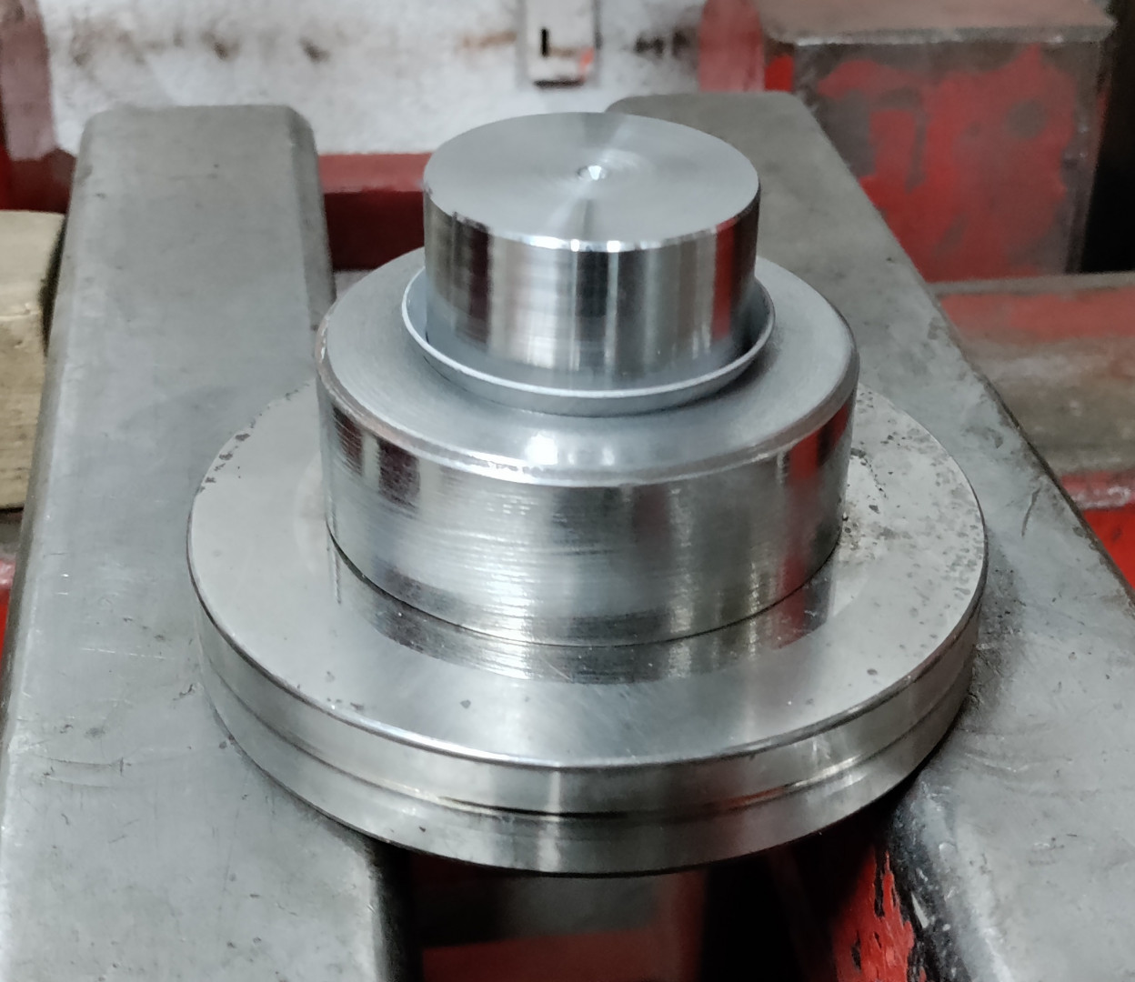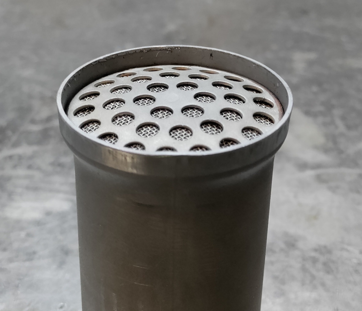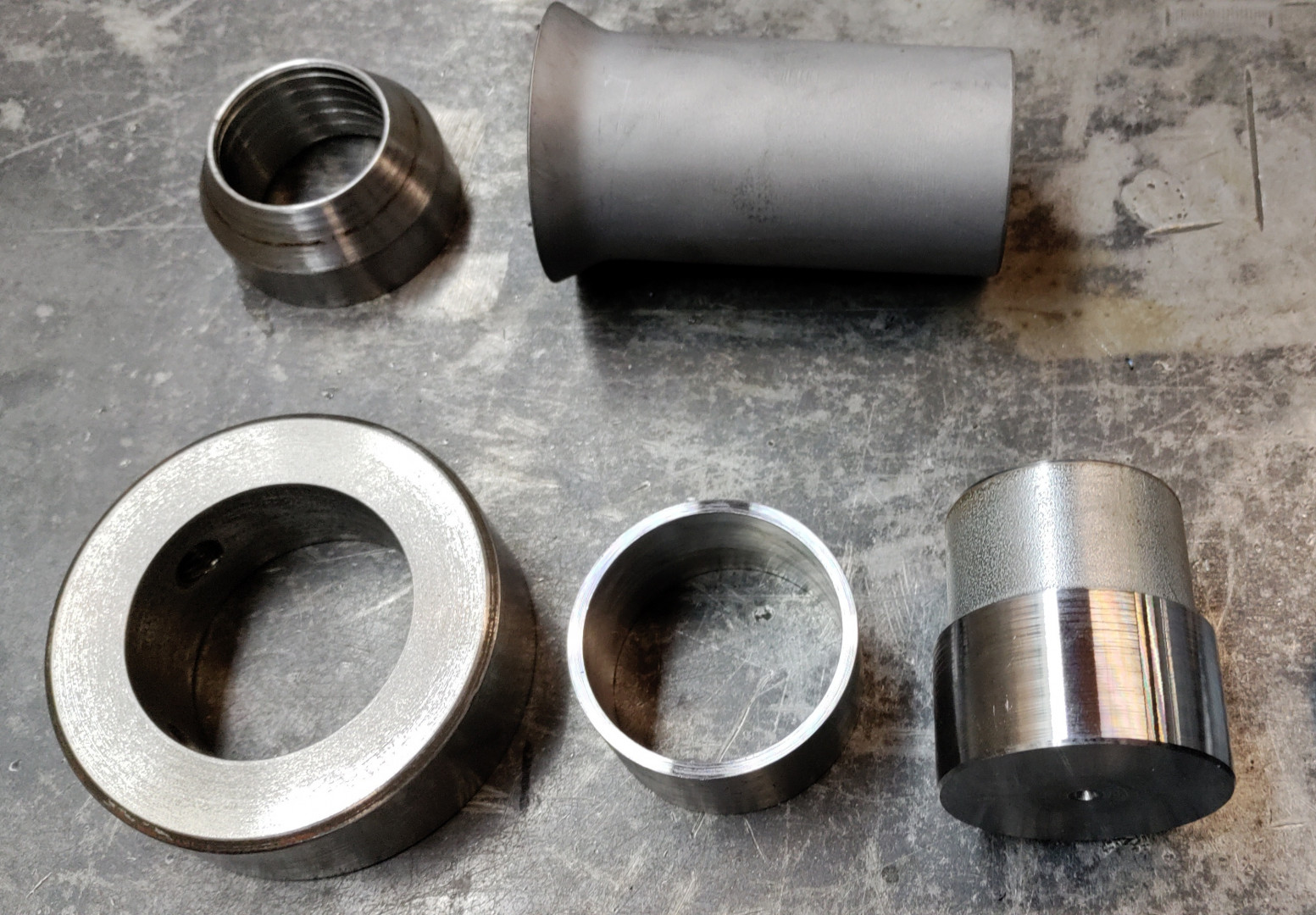 Ensin näytti että sen saisi pelastettua putkella jatkamalla suutinputken yläpuolelta. Puhalluksen jälkeen paljastui että on liian syöpynyt hitsattavaksi, paksuutta vain 0,4mm joissain kohdin. Löytyi 1mm seinämällä sopivaa vanhaa pöydän jalkaa ja 1mm peltiä, aloittelin tekemään muutamaa piippua. Putken alapäähän painoin prässillä 45 asteen sisäkartiolla supistuksen, johon sopiva lappu.