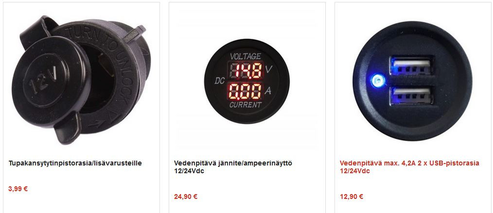 Niihin sitten tarpeen mukaan olen laittanut USB adapterin. Ajatuksean on ollut monipuolisuus, kun samasta pisteestä saa tarvittaessa 12V ja 5V.