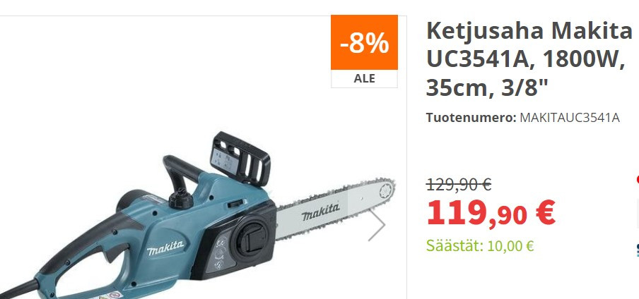 Makitan pitkittäisellä moottorilla on ollut käytössä, toimiva laite. Eilen katselin K-reudassa Makitan tarjouksia ja ainkakin poikittaismoottoril la oleva saha myytiin alle 200.- ( moottorin kulm ketjuun siis)