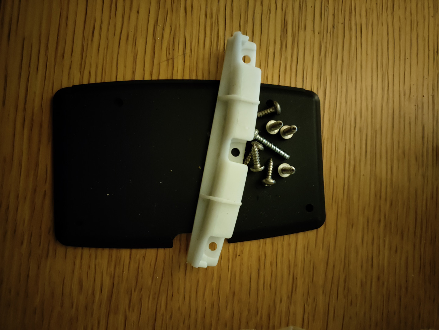 Löytyi meidän asuntoautosta avaamattomasta  paketista.  Ohut musta muovinen lätyskä, valkoinen  muovinen uhrattu osa sekä  7 ruuvia. Sama  määrä mitä kappaleissa reikiä. Mikähän tuo mahtaa olla.