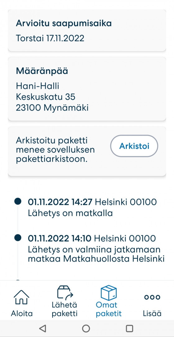 Noin kuukauden kuluttua posti ilmoitti paketin saapuneeksi - tänne Ylivieskaan, lähetyksessä oli valittu ihan oikea noutopaikka siihen samaiseen paikkaan mikä oli myös hänen Omapostissa.