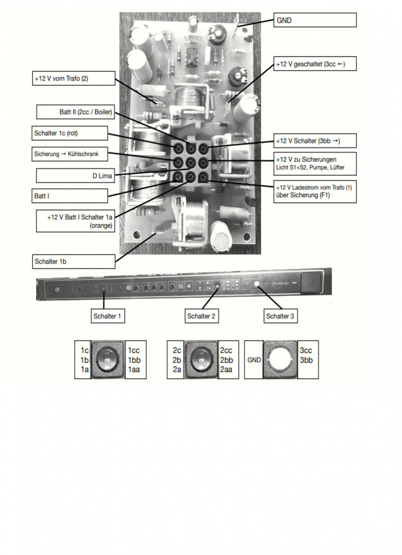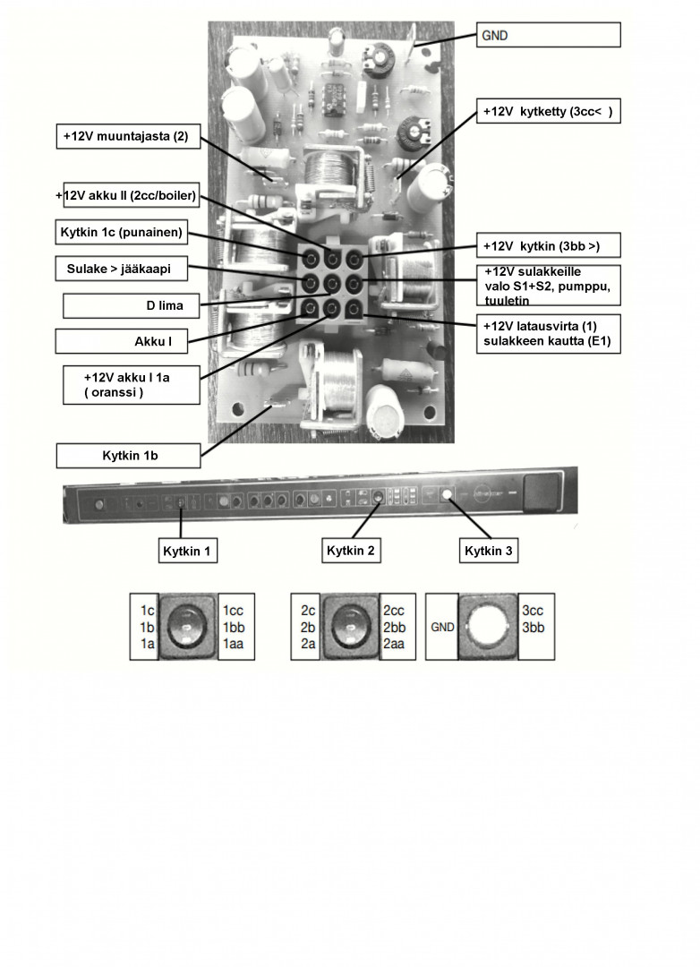 Tästä pystyy nyt seuraamaan juovia. Kuten kuvasta näkyy niin rele jonka kosketin palanut liittyy akku II:n lataukseen. Samoin keskirivin oikean puoleinen nasta , valoille, pumpulle ja tuulettimelle.