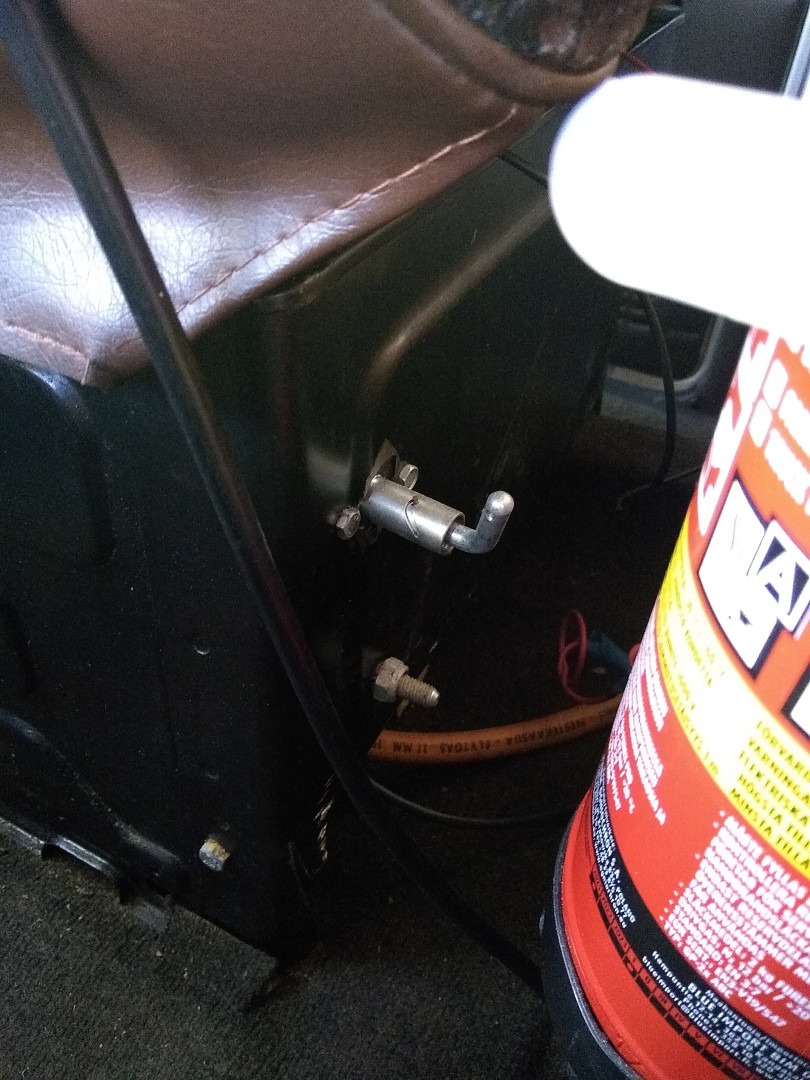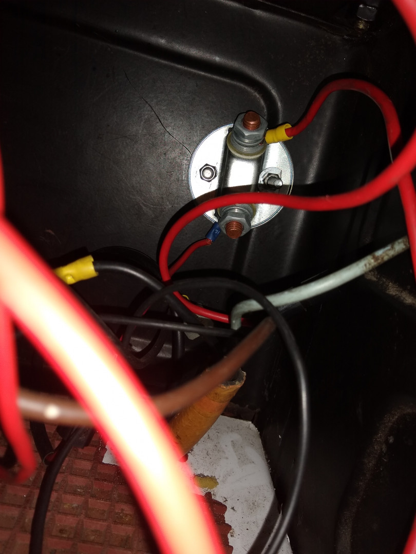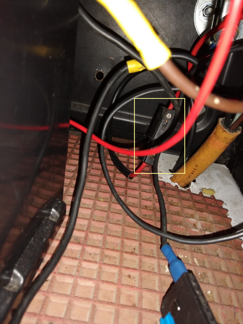 - Tuolla tosiaan on jokin iso metallinen kytkin apukuskin penkin takana metallirungossa kiinnitettynä, en tiedä onko alkuperäinen vai uusi. Siitä saa valittua kahden johdon väliltä kytköksen, en tiedä uskallanko kytkeä toiseen asentoon :D. On täällä onneksi sammuttimia. Toinen johto on akun + navassa ja toinen katoaa tuollaisen mustan rasian kautta pohjarakenteisiin. Mistäköhän siinä on kyse?