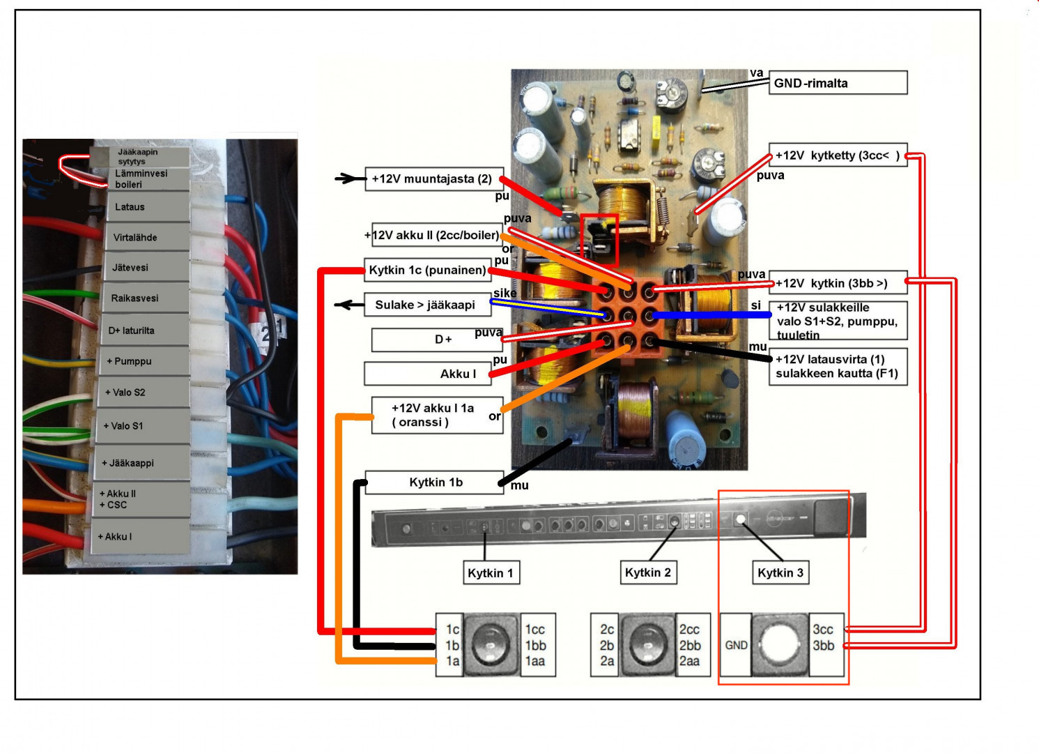OK, vaihdoin tuosta piirilevystä sen viallisen diodin sekä rele nro 3:n. Rele 1:stä en vielä vaihtanut, kokeilen sen vielä. Mutta mahdollisesti tämä 12V aktivointinappi on viallinen, en saanut mittarilla mitään reaktiota napin eri asentojen kanssa:  Onko tuossa ideana vain että se yhdistää ruskean moniliittimen +12V kytkin (3bb>):n tuon piirilevyn 12V kytketty (3cc<) laattaliittimen kanssa? Napin takana on kolme liitintä joista kaksi punavalkoista ja yksi valkoinen joka on maadoitus. Näiden punavalkoisten välille ei tullut yhteyttä vaikka nappia paineli. Eli jos ne yhdistää niin piirilevyllä menisi näin:  Nyt typerä kysymys: Jos haluan vaihtaa napin toiseen, pitääkö siinä olla tuo maadoitus myös? Vai voinko vain yhdistää testiksi nuo kaksi 12V johtoa toisiinsa, imitoiden napin "ON" asentoa? Täsmälleen samaa nappia (16RW2) ei tietysti enää mistään löydy, tarvisi korvike löytää jos kuntoon haluaa.