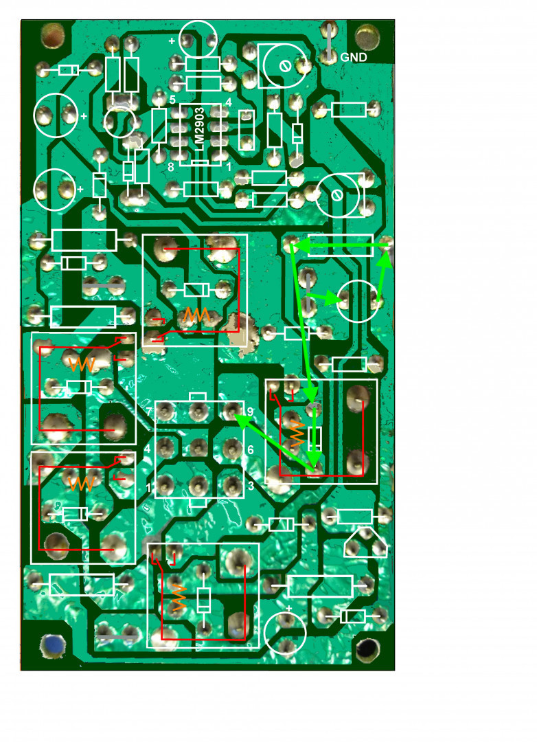 - Kondensaattoreista en osaa ihan sanoa. Ilmeisesti ne ainakin imee sisälle virtaa mutta voinko yleismittarilla "syöttää" virtaa ne täyteen ja sitten mitata voltit jolloin ne olisi kohdallaan? (Tuo keltainen laatikko ylhäällä LM2903 -sirun vieressä on ilmeisesti 68nK63 -kondensaattori: https://shopee.co.id/CAPASITOR-68nK-63-volt-mkm-i.333744533.3770872148)