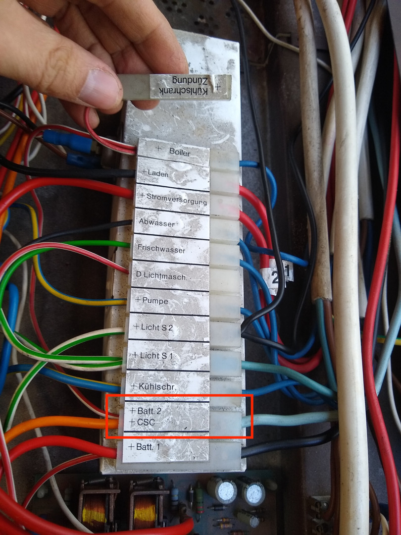 - alkuperäisen jääkaapin 230V johto on ainakin irrotettu, eli ei ole sentään iskun vaaraa - arvioisin että uudet johdot on vedetty juuri akusta tähän uuteen jääkaappiin koska jääkaapin 12V kytkentä on myös irroitettu. Molemmat päät avoimina akun ja jääkaapin läheisyydessä. Jatkuvuustestillä vahvistui samaksi johdoksi.