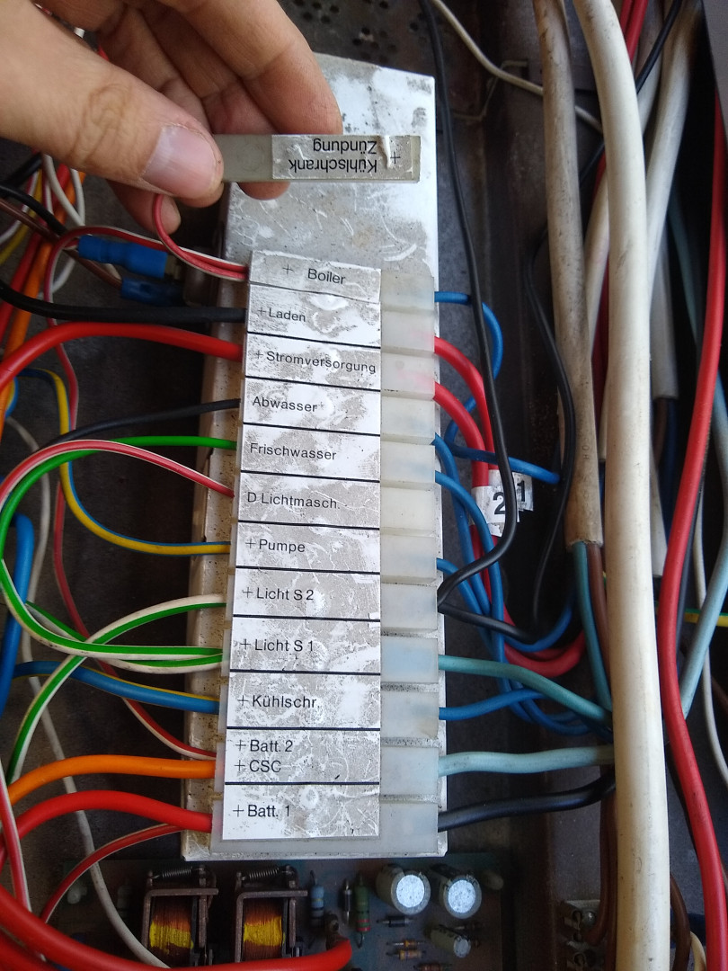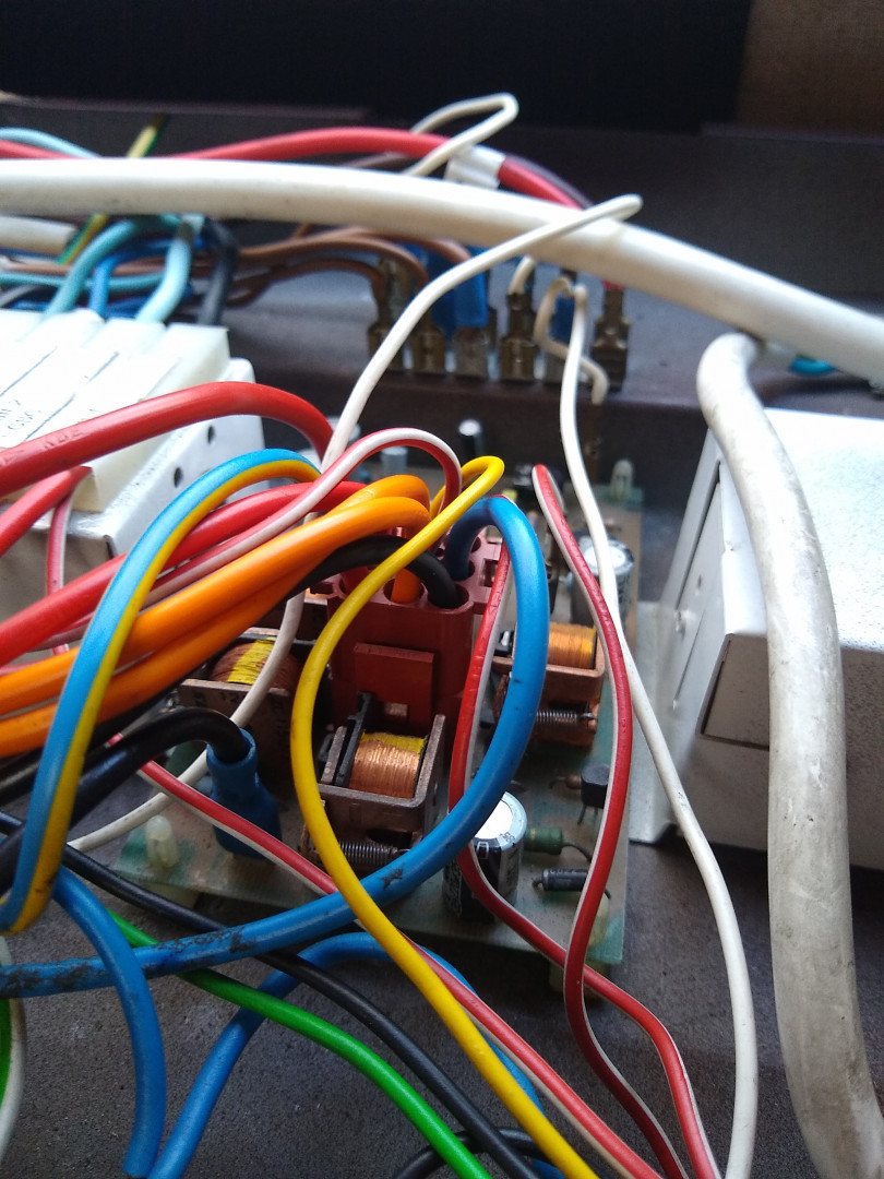 Avasin ohjauspaneelin tänään kunnolla ja löysin tällaisen piirilevyn sisältä:  Mielestäni useampi vaste on rikki, eivät antaneet mitään lukemaa. Kondensaattoreista en osaa varmaksi sanoa, kun ensin kokeilin jatkuvuutta, sen jälkeen mittasin voltteja niin oli kerännyt ainakin siitä sisäänsä ja voltit laski hiljalleen kun lukemaa seurasin. Eli, muuntajan johdot menevät täällä kiinni, piiri on vain osittain kuollut. Alla muutama kuva sisällöstä:   Muuntajan johdot selkeästi numeromerkattu sekä saksaksi johdotuksia nimetty: