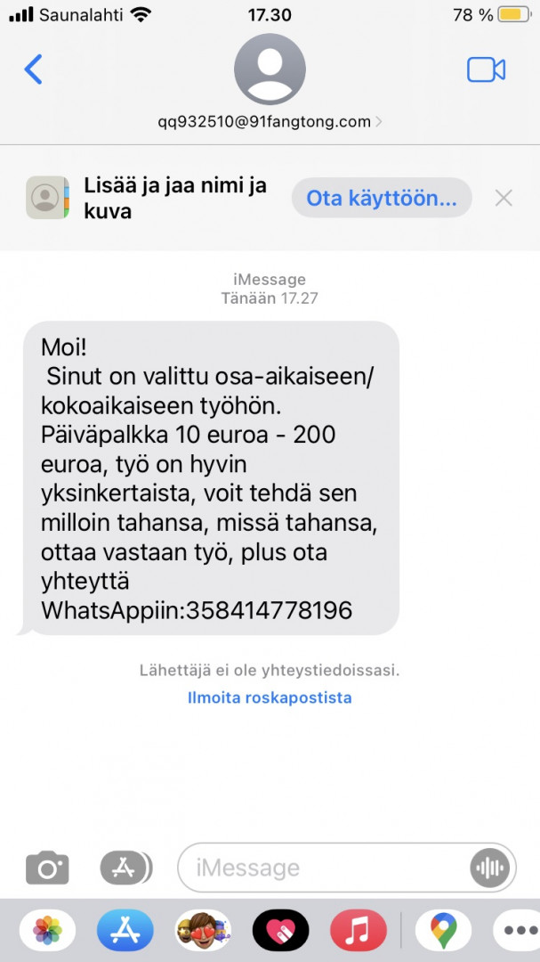 Taas on nettihuijarit aktivoituneet ja alkaneet lähetellä kalasteluviestejä