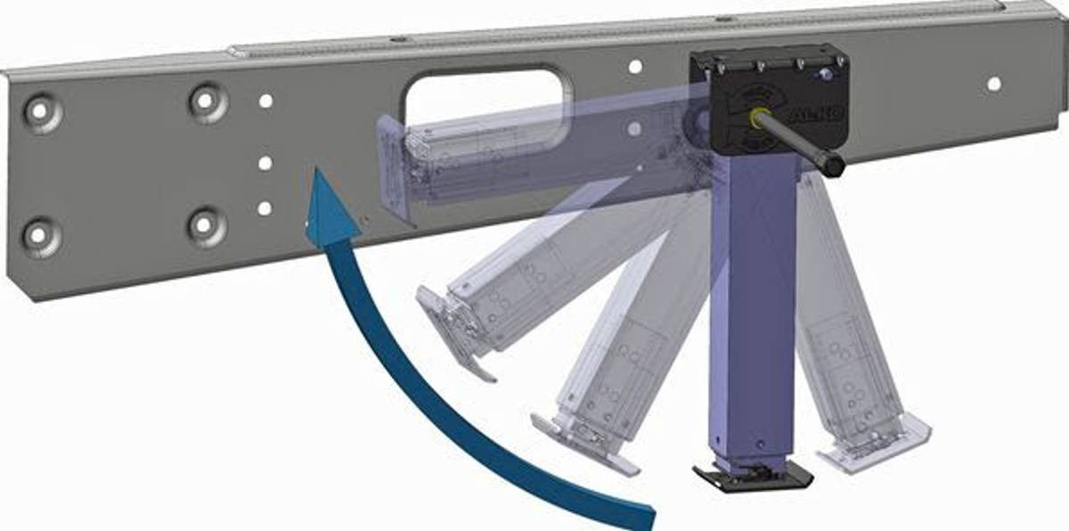 Tulee kuvan mukaisesti veivinpää helman alapuolelle. Ei tartte alle siten mennä, eikä edes katsoa sinne kun helmassa tehtaan merkit minne veivin sörkkii. Tehtaan veivi, pitkävartinen kuten vaunuissa on aina vakivarusteena. Tukijaloissa on pituuden esisäätö (4 eri asentoa?) sokalla. Niitä jos lähtee roplaamaan, menee konttaushommiksi.. valittu asento on toiminut hyvin.