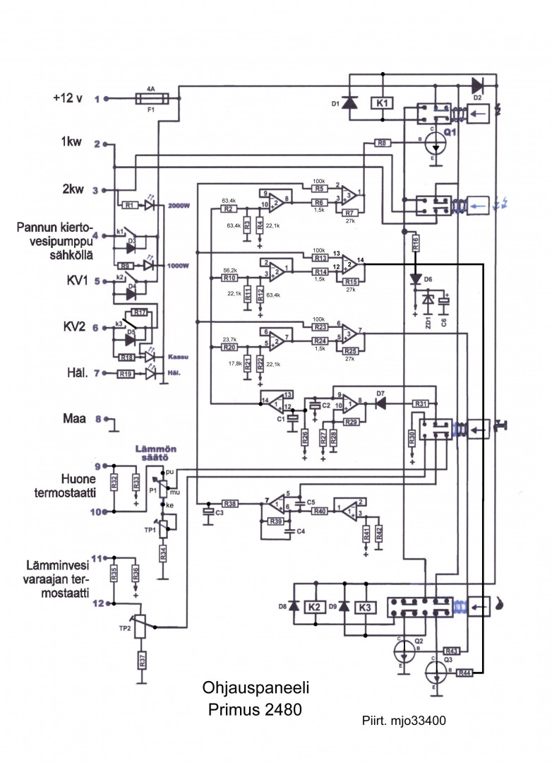 Paneeli paikallaan, kiertovesipumppu pyörii kun kaasun painaa päälle, muuta ei tapahdu, hehkulle tulee virtaa sytytyskäsky päällä 0.33v, kaasuventtiili ei vedä. Mistäköhän jatkais tutkintaa?