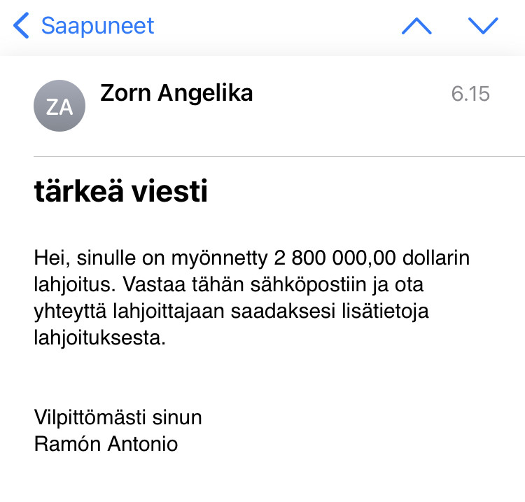 ![]() Onhan näitä.. Melko heikkotasoinen luomus. ![]() Pankkipuolella ovat pystyneet parempaa ja päässeet tuloksiinkin. Samoin rakkausasioissa. Melko heikkotasoinen luomus. "Nordealta" ja "Osuuspankilta" minulle tulee muutama viesti viikossa. Yleensä nniissä pyydetään allekirjoittamaan sähköinen viesti. Alkuun kieli oli todella tökeröä, nykyisissä huomattavasti parempi Olen tänä vuonna saanut vasta yhden 4,2 miljoonan dollarin lahjoituksen.