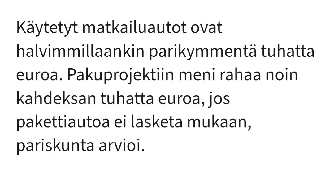 Tämän avauksen tarkoitus ei muuten ollut kustannusvertailu. Valmiin matkailuauton saa sillä millä pakuun ja sen rakenteluun kuluu.