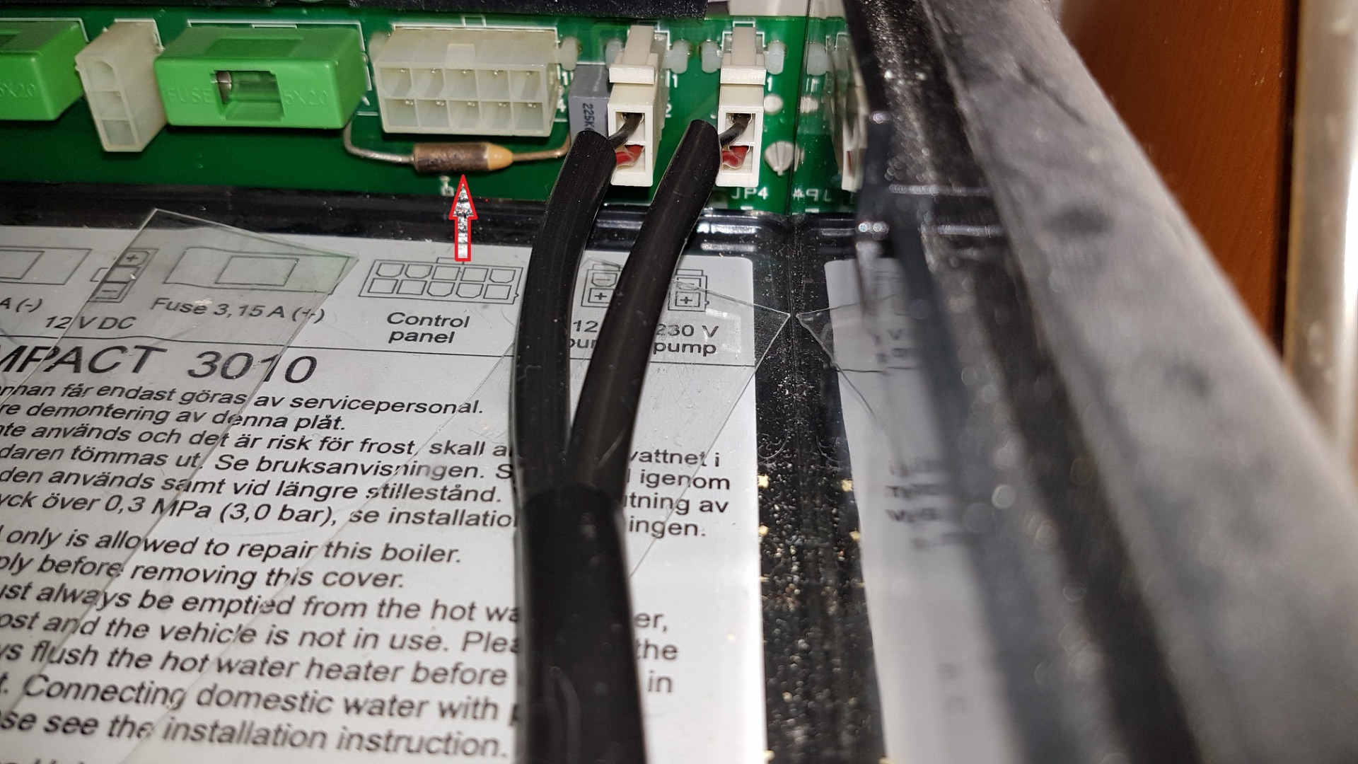Pannun kyljessä saattaa olla toinen pumppu, joka toimii silloin kun vaunu on sähkössä kiinni. Se voi olla rikki. Pyöriikö vispiläpumppu silloin, kun vaunun johto ei ole kiinni sähkössä ja lämmitys on päällä kaasulla?