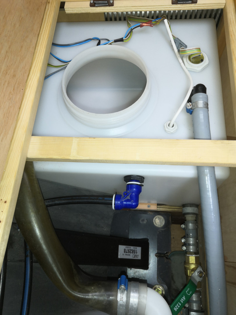 pannu on noin 30cm ylempänä kuin vesisiliön pohja  vesisäiliö on lattian tasossa   tuossa pannun tyhjennys - ihmettelen tuota teippisätöstä tuossa toisessa päässä - pitäisikö siitä jatkua jonnekin letku?