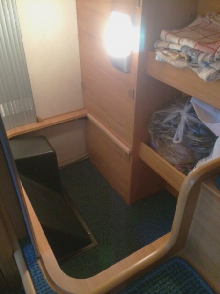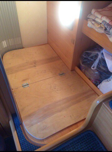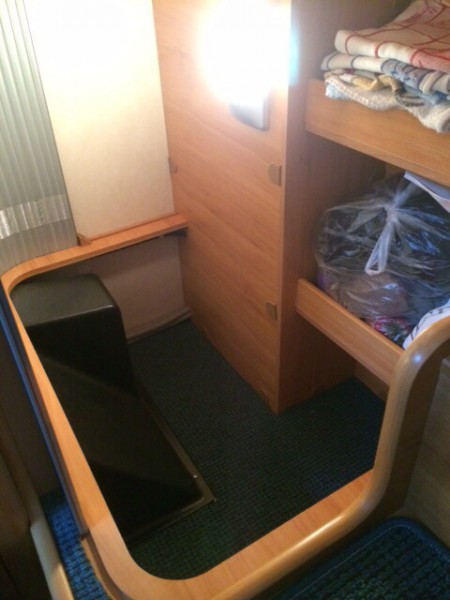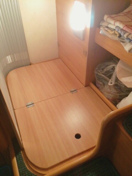 Adrian tuunausta jatketaan, takana oikealla sängyn alla on puoli-korkea vaatekaappi jossa ei kuitenkaan tule vaatteita tangosta ripusteltua vaan tuotakin tilaa tulee käytettyä lähinnä mehujen ja reppujen säilytyspaikkana, mutta ongelmaksi ollaan nähty tuon tilan epäkäytännöllisyys, kapea alhaalta lokasuojan takia mutta korkea ja leveä ylhäältä.