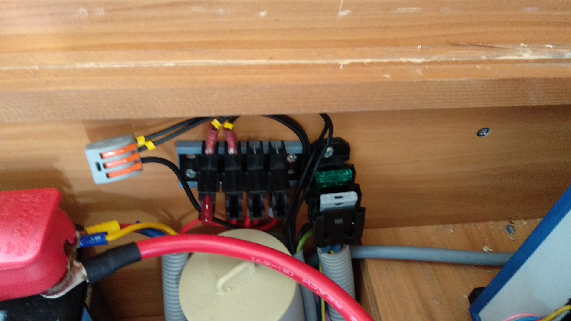 Puristelin liittimet kireäksi ja homma toimii edelleen. Ne johdot roikkuu vielä ilman mitään vedonpoistoa sen sulakkeenpitimen pohjassa.