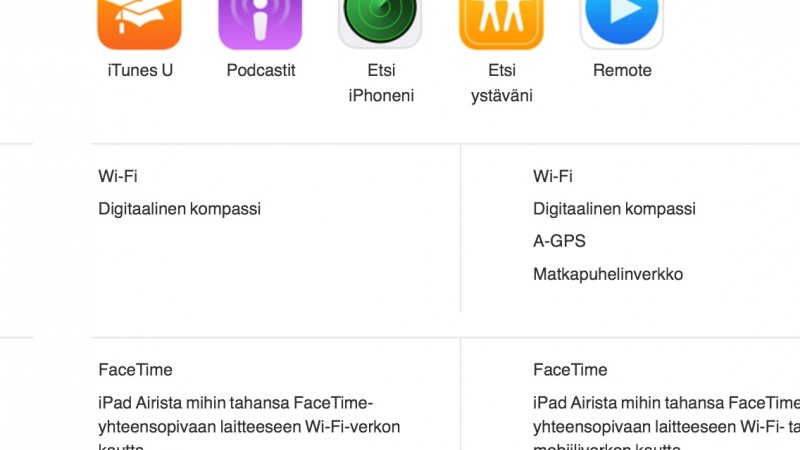Ei ainakaan lasten iPad mineissä ole sitä gepsiä vaan jos niillä haluaa naveilla niin silloin yhteys on otettava puhelimesta. Specseistä en muuta eroa huomannut kuin juuri tuon gepsin olemassaolon tässä wifi + cellularissa. http://www.apple.com/fi/ipad-air/specs/Joo eihän meilläkään ole kotona kuin reititin josta kaikki ottaa netin halutessaan, reissuille sitten reititin vaan mukaan.
